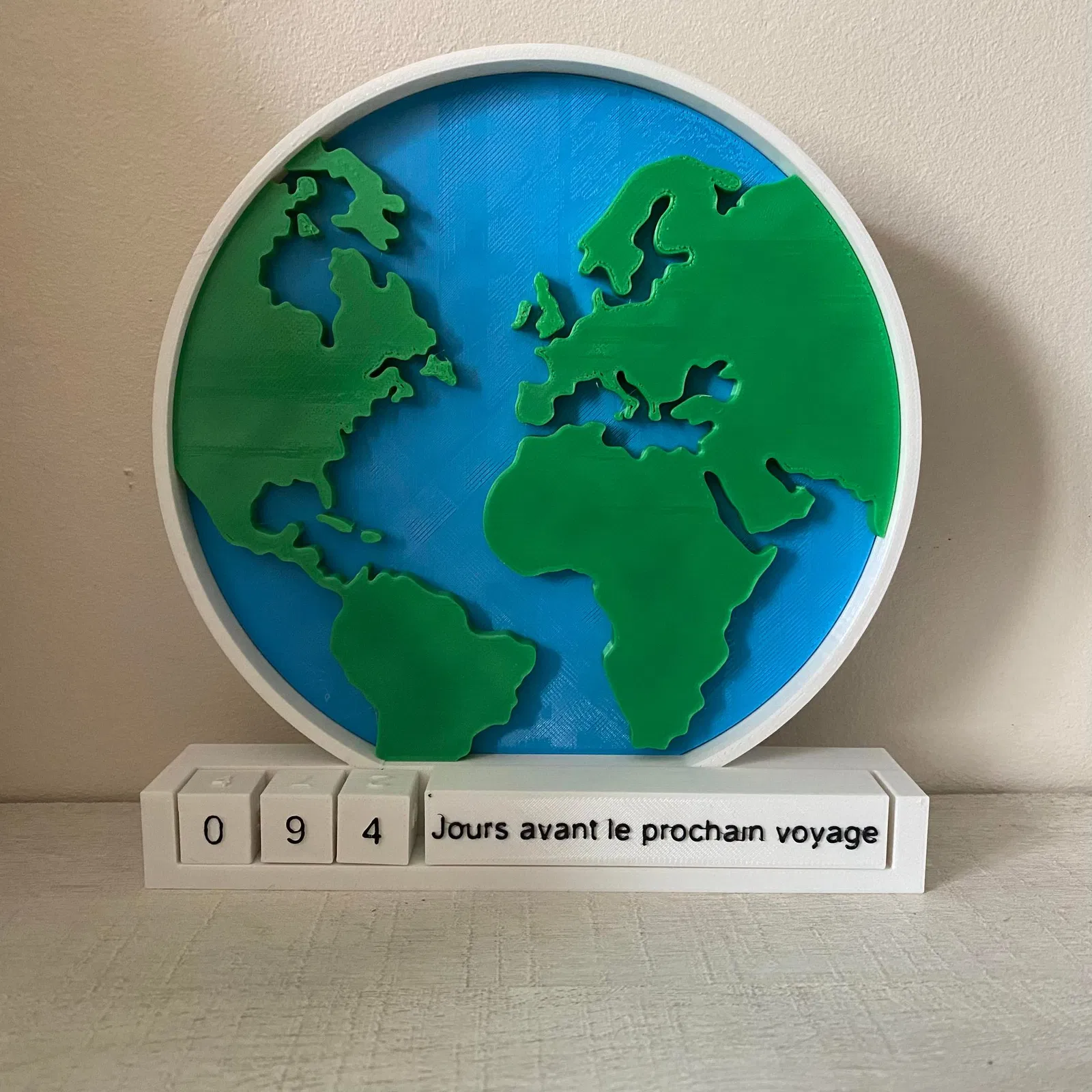 Đếm ngược thời gian cho những chuyến đi sắp tới của bạn! Thiết kế này rất hữu ích để theo dõi lịch trình du lịch. In bằng PLA, có tùy chọn in một hoặc nhiều mảnh. File có sẵn tiếng Anh và tiếng Pháp. Bản quyền thuộc về nhà thiết kế.