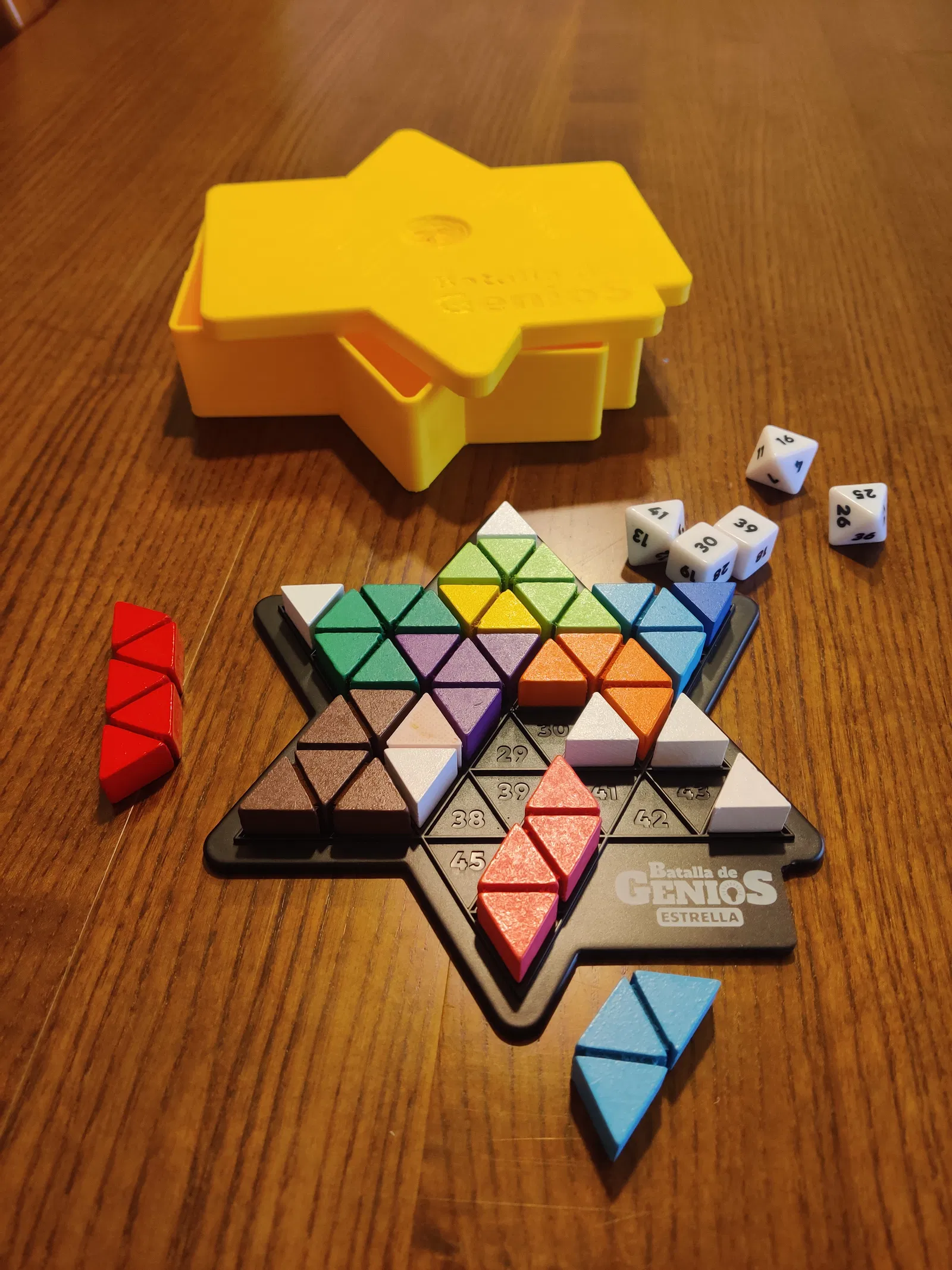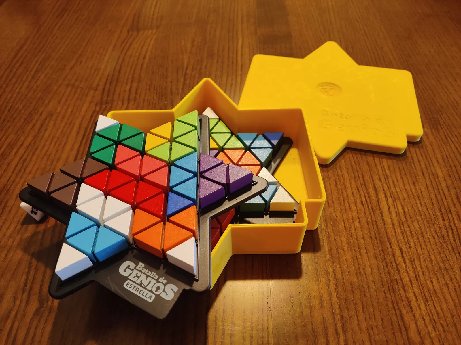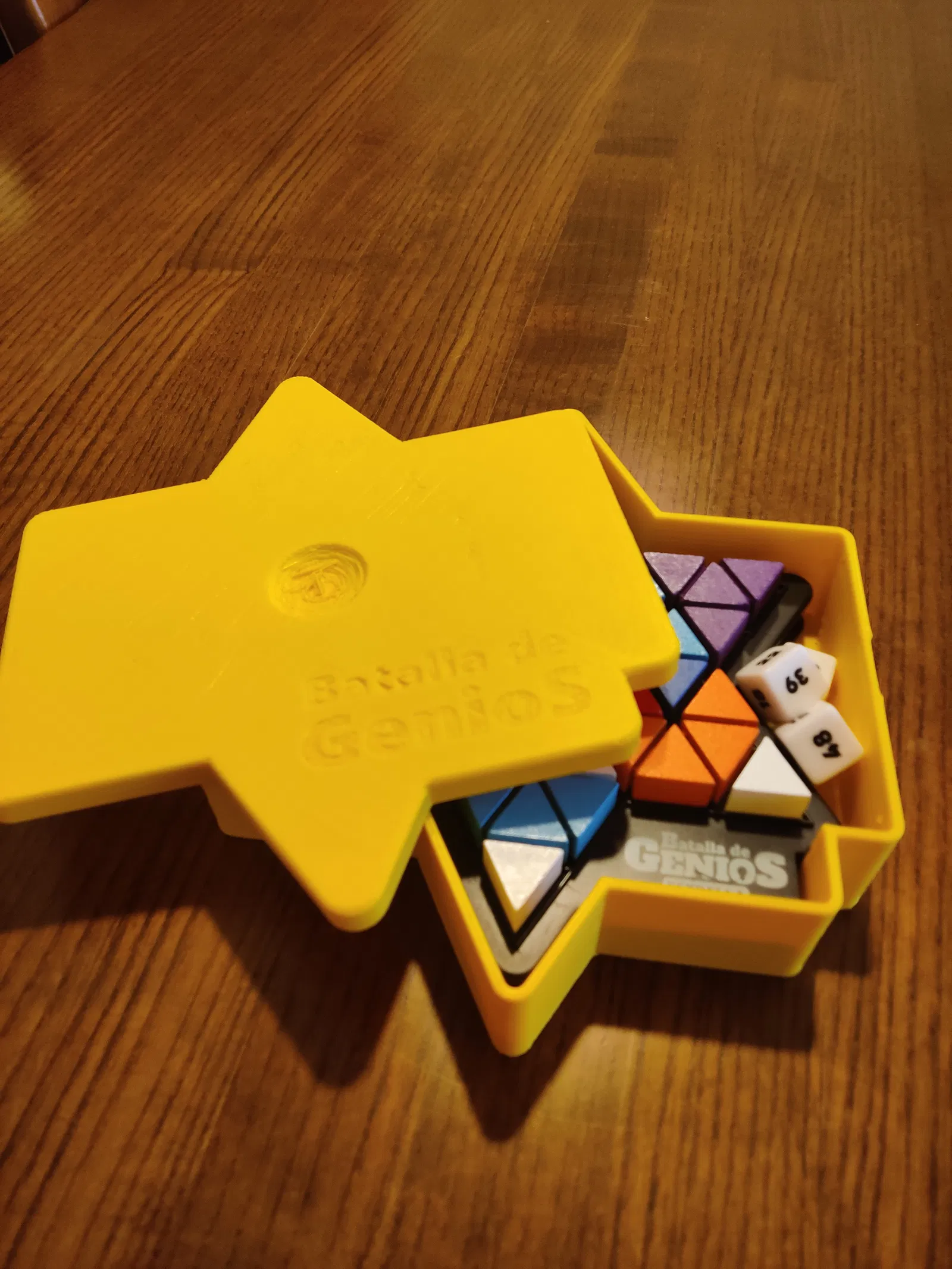 Chiếc hộp này được thiết kế để đựng trọn bộ trò chơi "Batalla de Genios Estrella", giúp bạn bảo quản và sắp xếp các quân cờ một cách gọn gàng. Sản phẩm được in bằng công nghệ tiên tiến với đầu phun 0.4mm và độ dày lớp in 0.32mm, đảm bảo độ bền và thẩm mỹ cao.