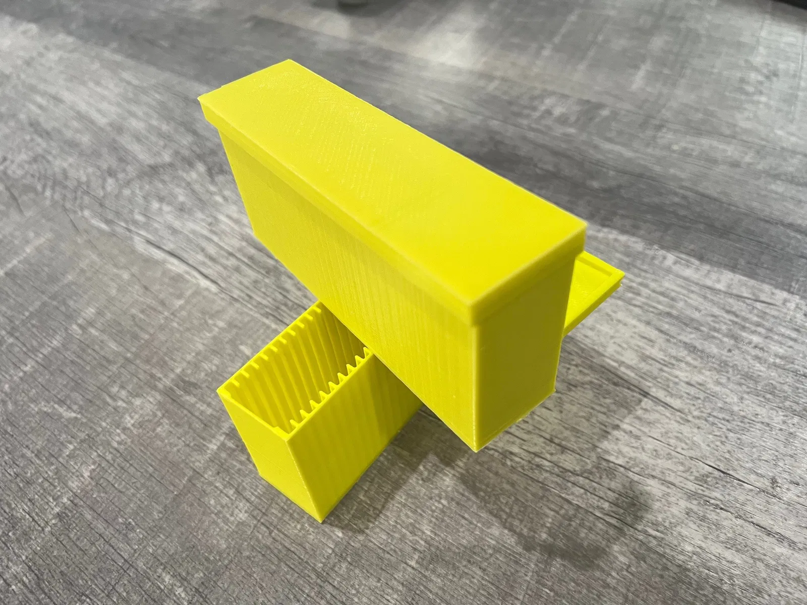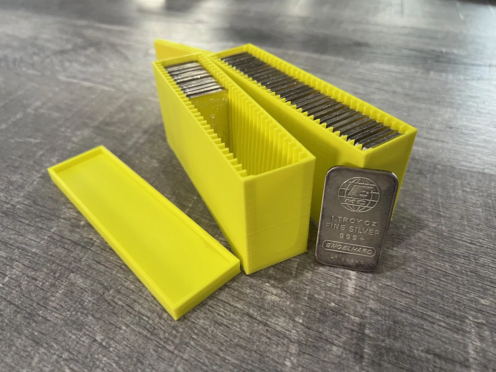 Hộp nhỏ có nắp, đựng được tối đa 30 thanh bạc 1oz không có bao nhựa từ xưởng đúc. (Tui mới tập tành làm mô hình 3D, nên mọi người nhẹ tay nha, đừng làm tui nản lòng với cái thiết kế này.)