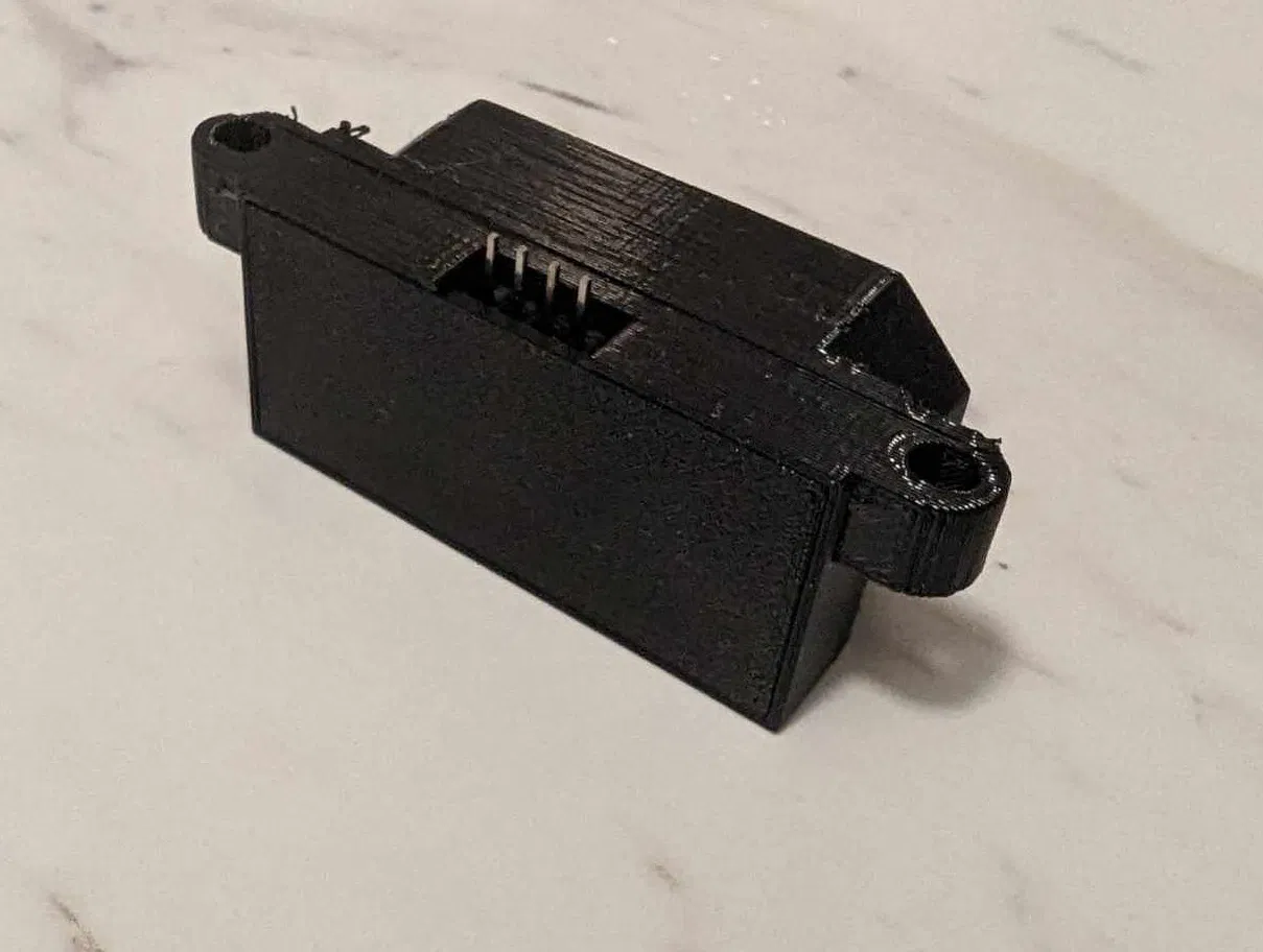 Phôi in 3D giá đỡ cảm biến siêu âm HC-SR04. Phôi này được in bằng nhựa PLA màu đen Jet Black của Prusament, và yêu cầu vật liệu hỗ trợ để có bề mặt đẹp nhất, đặc biệt là ở mặt đáy.