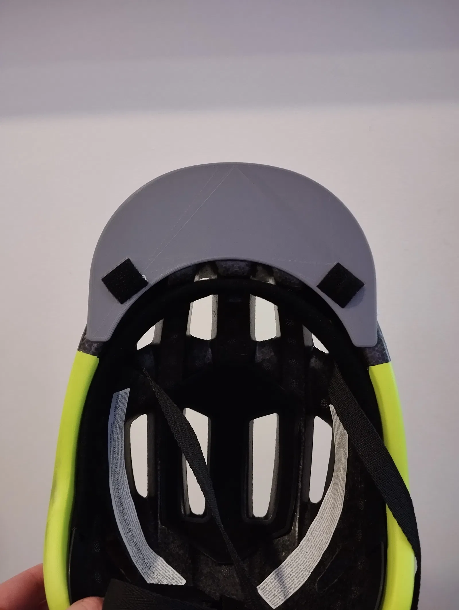 Cái mui che có thể gắn thêm vô mũ bảo hiểm, có khe (2cm x 2mm) để luồn dây velcro hoặc dây rút nhựa. Mô hình này đã được thử nghiệm trên mũ bảo hiểm Decathlon Btwin 500 (đường kính trong 15cm, cỡ L).