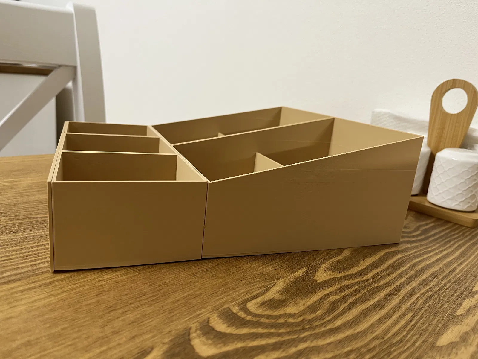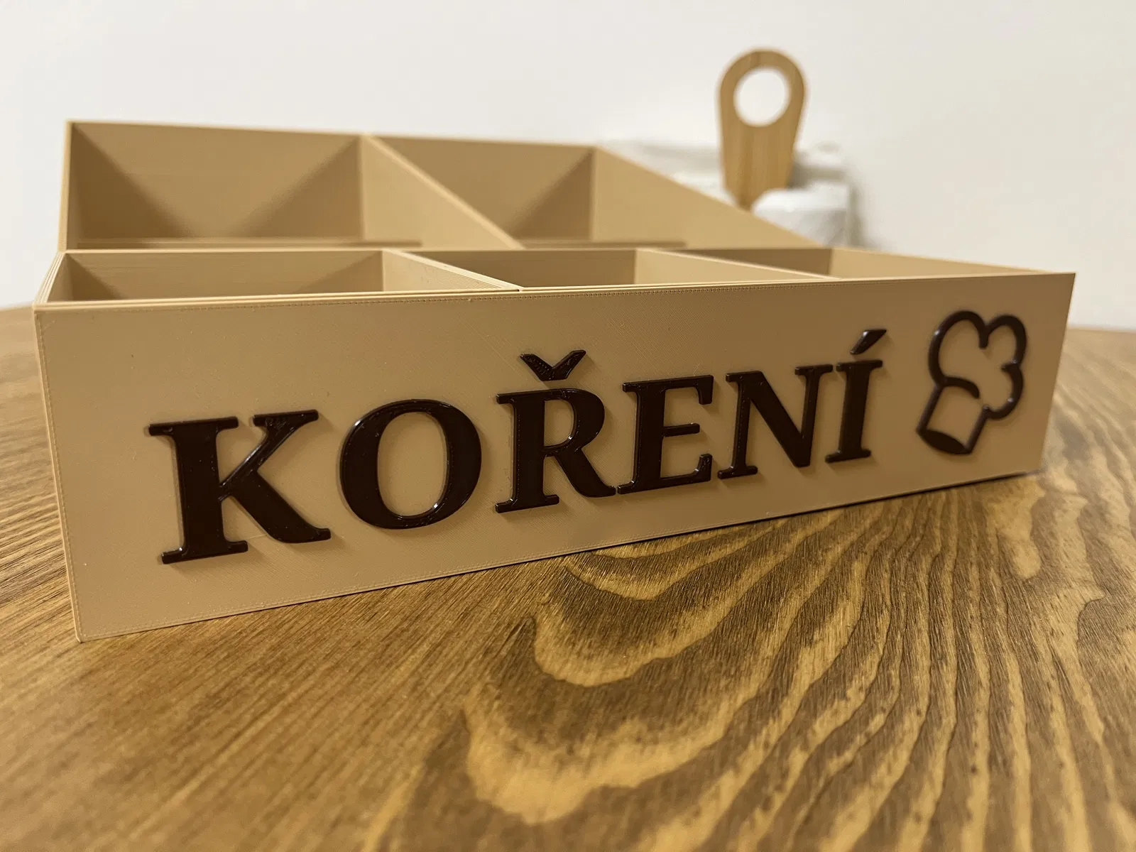 Hộp đựng gia vị được ghép từ hai hộp lớn phía sau và ba hộp nhỏ phía trước, cùng với chữ khắc phía trước có thể dán thêm. Kích thước 240mm x 280mm.