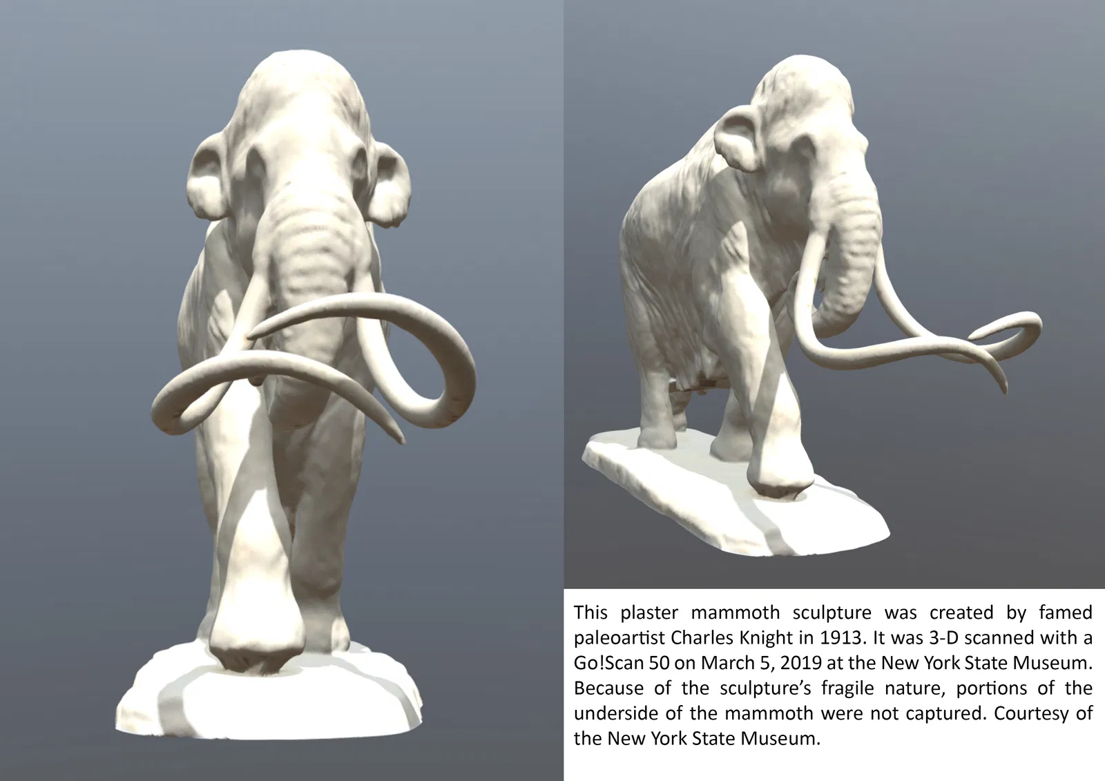 Tác phẩm điêu khắc voi ma mút bằng thạch cao này được tạo ra bởi nhà cổ sinh vật học nổi tiếng Charles Knight vào năm 1913. Nó đã được quét 3D bằng Go!Scan 50 vào ngày 5 tháng 3 năm 2019 tại Bảo tàng Bang New York. Do tính chất mỏng manh của tác phẩm điêu khắc, các phần dưới của voi ma mút đã không được ghi lại. Được sự cho phép của Bảo tàng Bang New York.