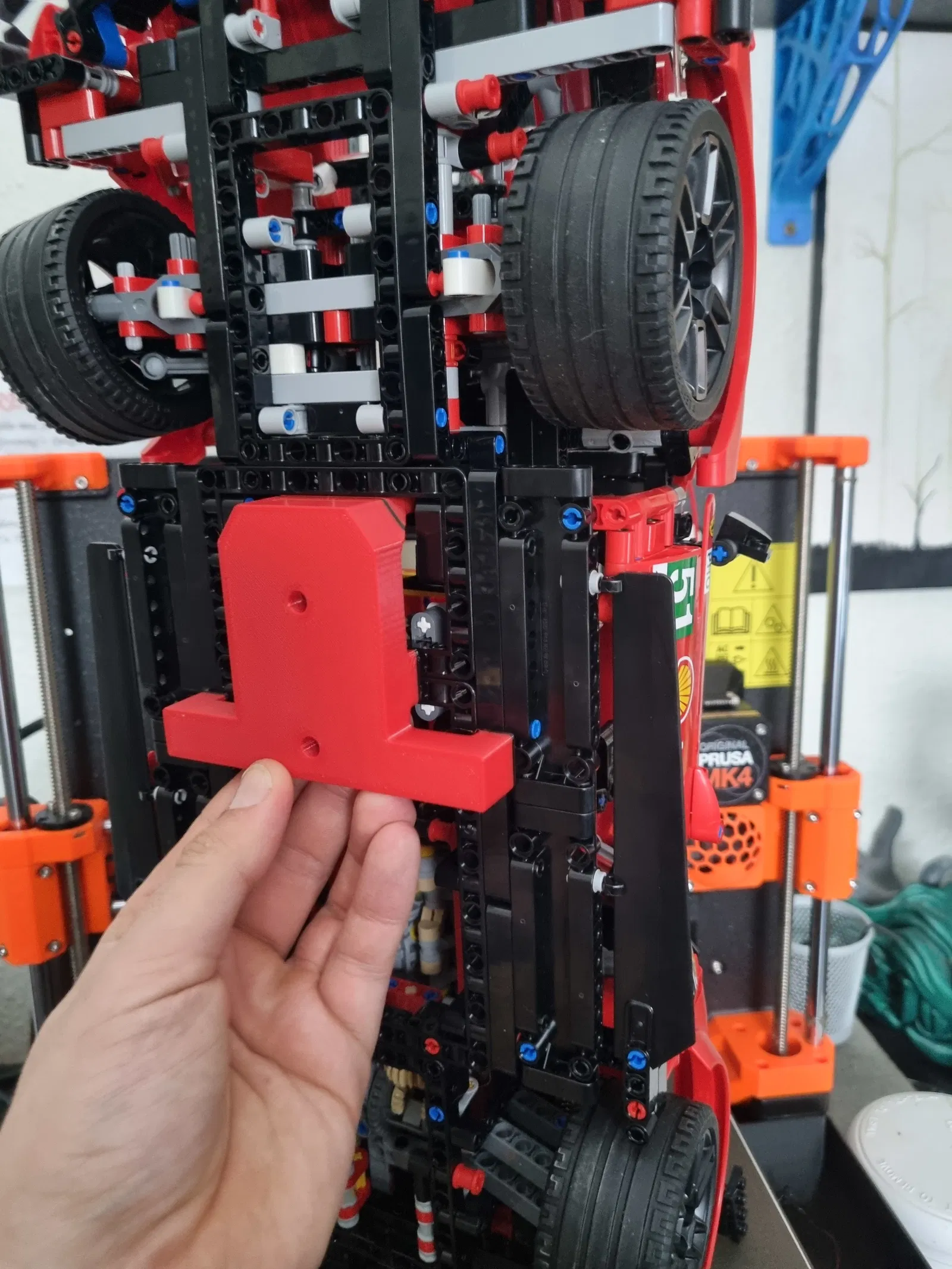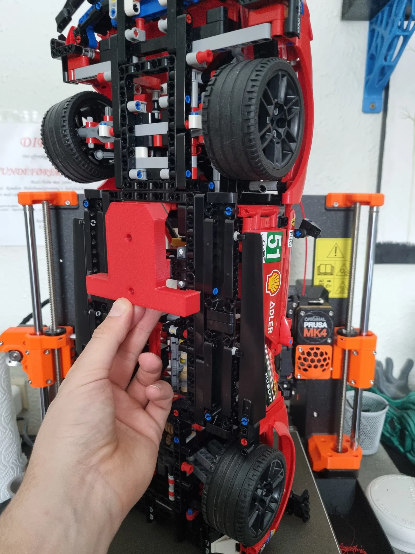 Cái đế treo tường đơn giản mà đẹp cho bộ LEGO Ferrari 488 GTE, bộ mô hình 42125. In bằng PETG với Nozzle 0.6, 2 perimeters, 20% infill gyroid. Kích thước lỗ khoan và khoét được mô tả chi tiết.