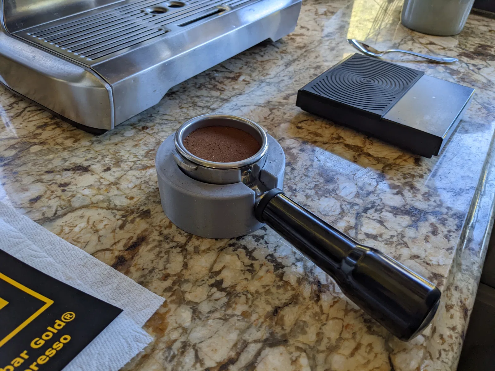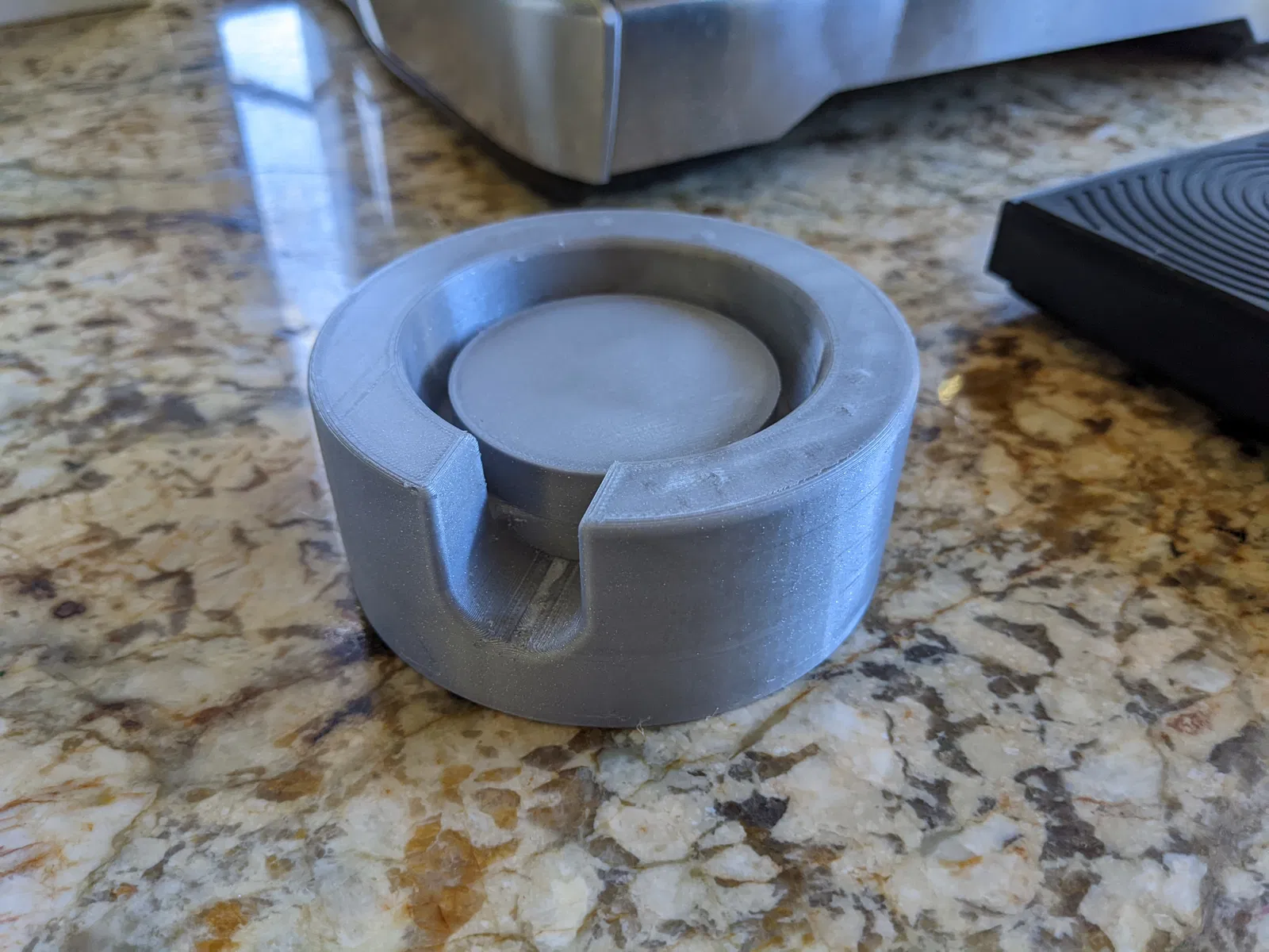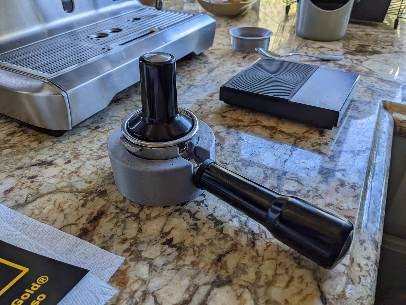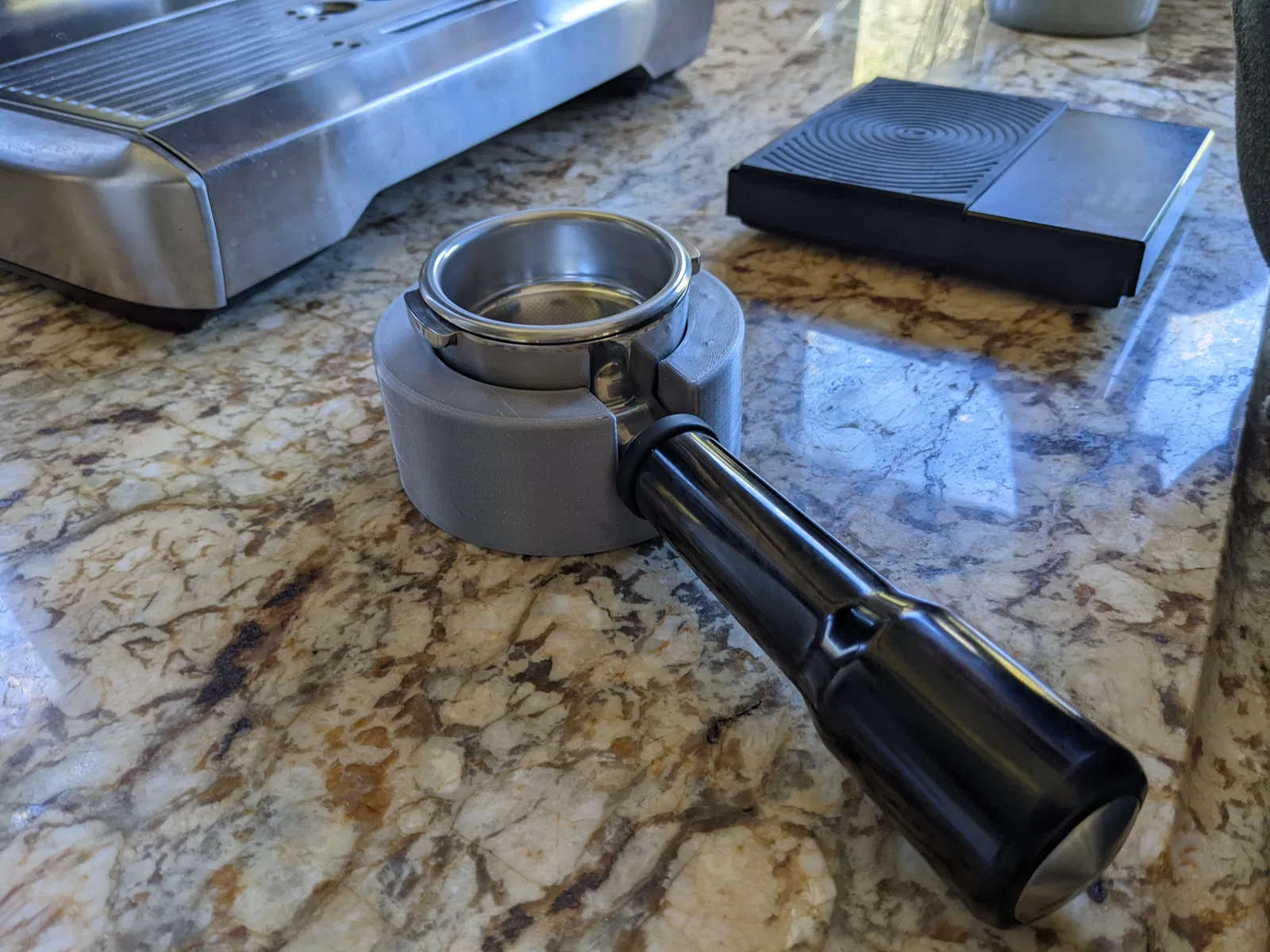 Đây là cái đế tui thiết kế cho cái portafilter đáy rỗng Breville 58mm để dễ nén cà phê hơn.