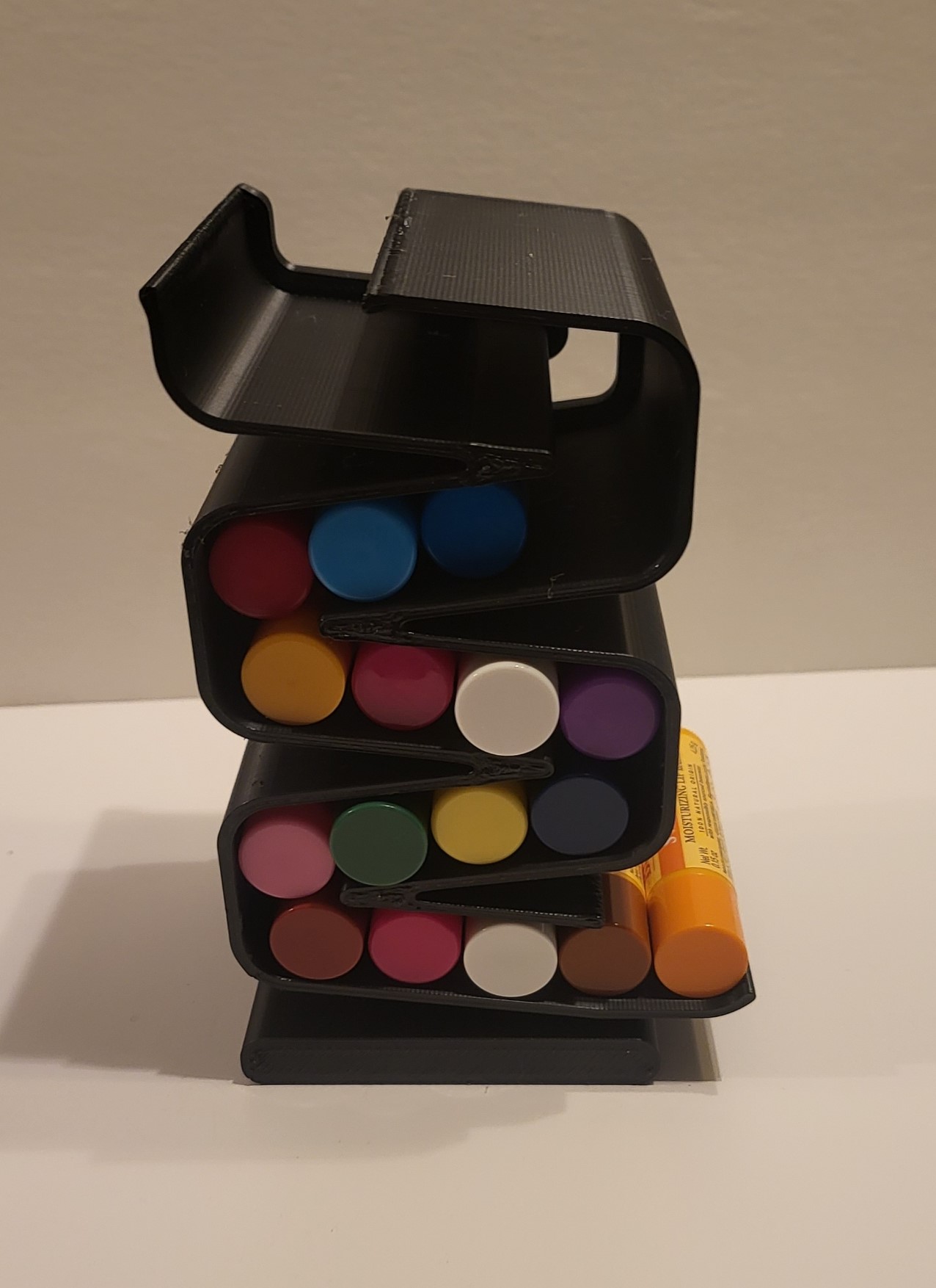 CẬP NHẬT - Sau một thời gian sử dụng thì vợ tui có vài chỉnh sửa nhỏ mà bả nghĩ sẽ làm cái này hoạt động tốt hơn. Cổng vào/ra cho son dưỡng môi đã được dời ra phía trước và cái gờ ở dưới đã được làm dày hơn để ngăn son dưỡng môi bị đẩy ra ngoài do sức nặng của cả đống son.