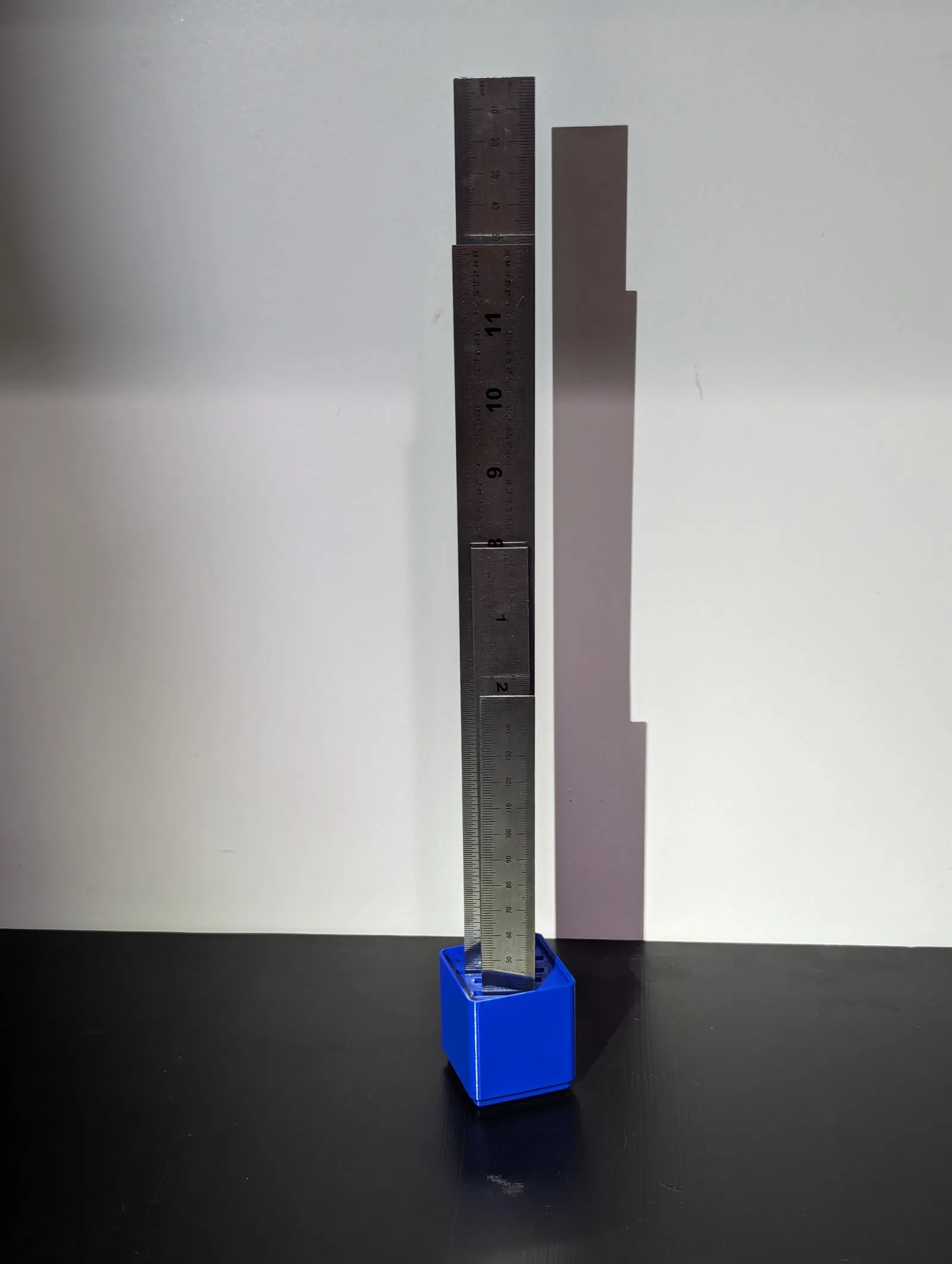 Đây là một khay Gridfinity 1x1 được thiết kế để đựng thước kẻ, tương thích với hệ thống Gridfinity của Zack. Các thước kẻ được giữ thẳng đứng để tiết kiệm diện tích. Khay khá chắc chắn dù có chiều cao khi gắn nam châm, tuy nhiên nếu va vào phần trên của thước kẻ thì nó sẽ bị đổ.