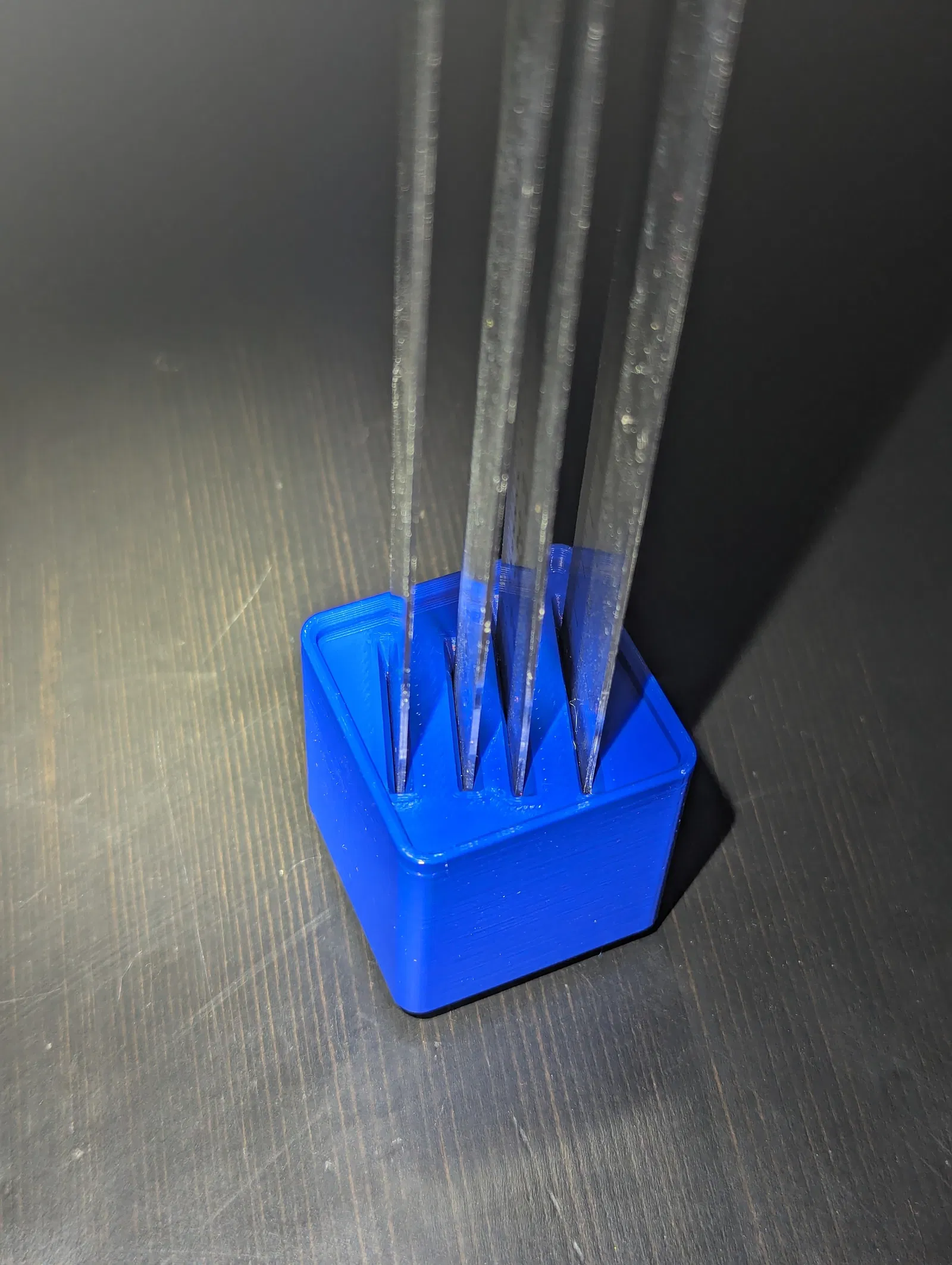Khay Gridfinity 1x1 này giữ 4 thước kẻ thẳng đứng, tiết kiệm không gian. Khe cắm vát, bố trí so le giúp dễ dàng lấy và cất thước. Có lỗ nam châm 6x2mm ở đáy. In bằng PLA+, không cần support. Tệp nguồn có sẵn để tùy chỉnh.