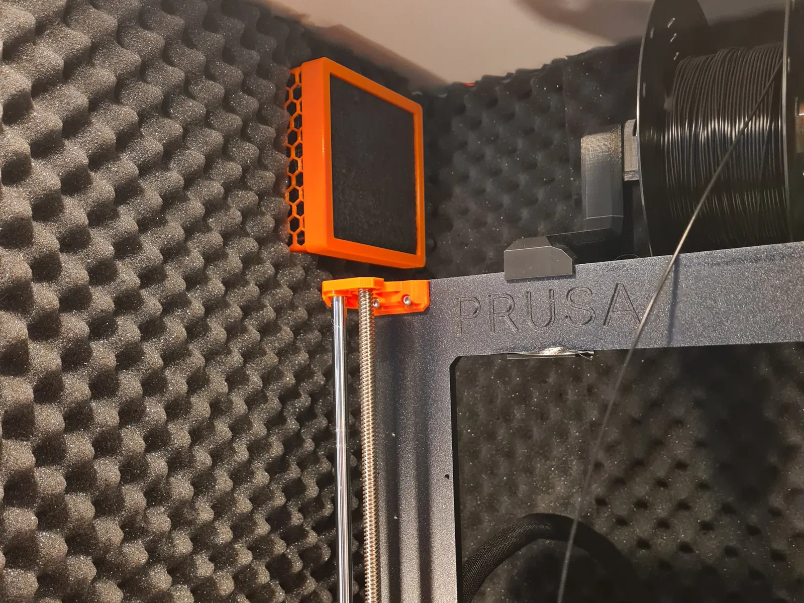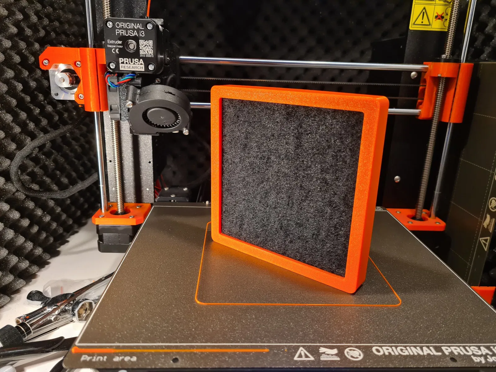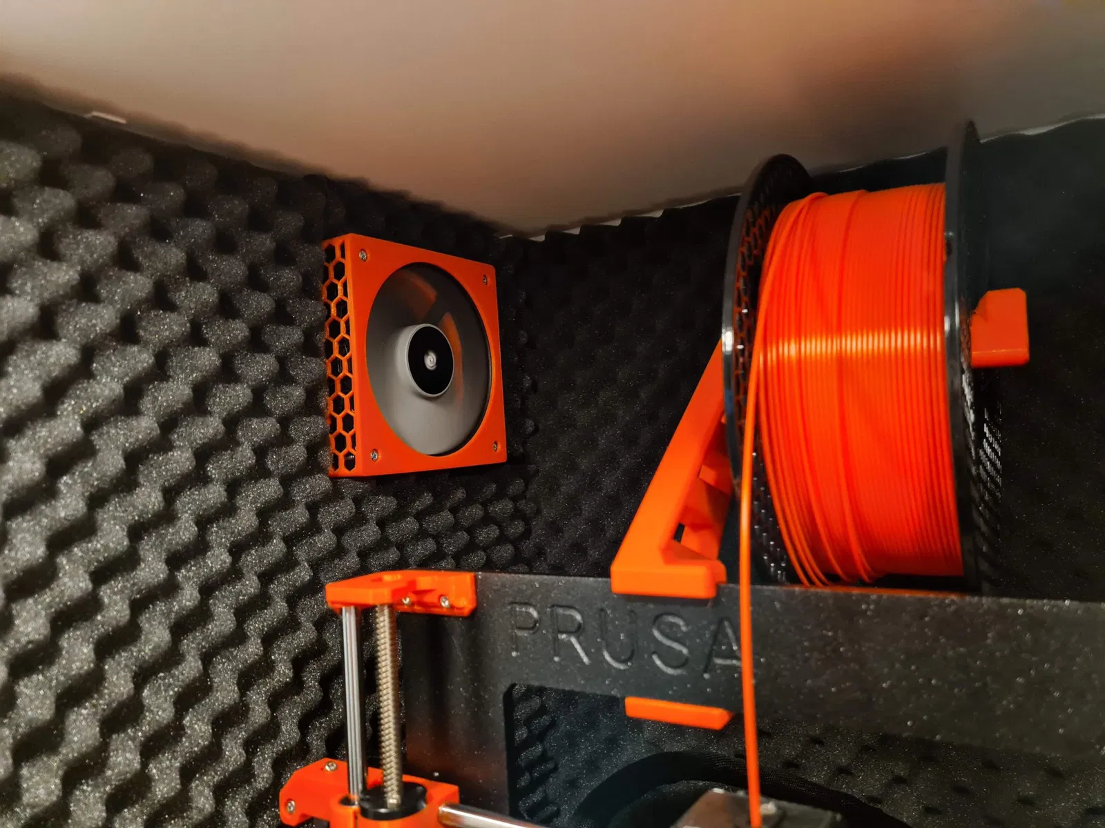 - Cắt một số vật liệu lọc và nhấn vào vị trí bằng nắp lọc. Sử dụng một bộ lọc có độ dày 8-15mm. Hiện tại tôi đang sử dụng một bộ lọc dày 15mm được nén vào vị trí bởi nắp lọc. Tôi đang nghĩ đến việc thêm một lớp lọc nữa cho các hạt nhỏ hơn nhưng quạt đang gặp khó khăn trong việc đẩy không khí qua nó như hiện tại. Quạt cần phải chạy ở tốc độ tối đa trong trường hợp của tôi để có thể tạo ra lưu lượng qua bộ lọc. Nhưng có vẻ như đủ để loại bỏ mùi PLA trong phòng của tôi với quạt và thiết lập PSU hiện tại. Để xây dựng vỏ IKEA Platsa, ### Hướng dẫn in In bằng Prusament màu cam với lớp 0.2mm. “Nắp lọc bên trong” được thiết kế cho lớp 0.3mm. Chưa thử nghiệm in các phần khác với 0.3.