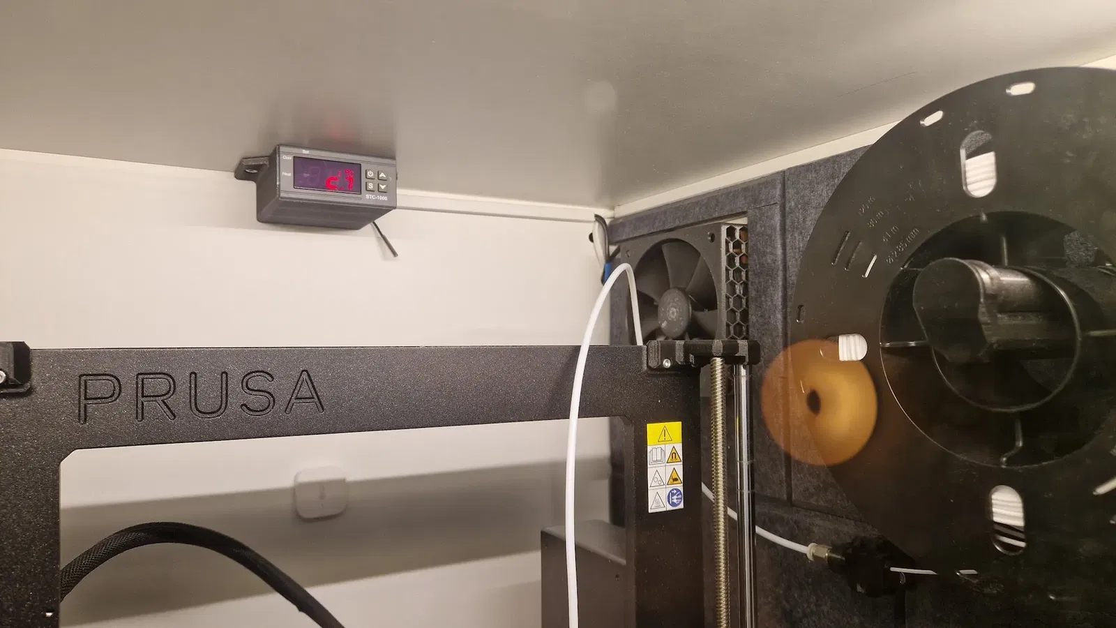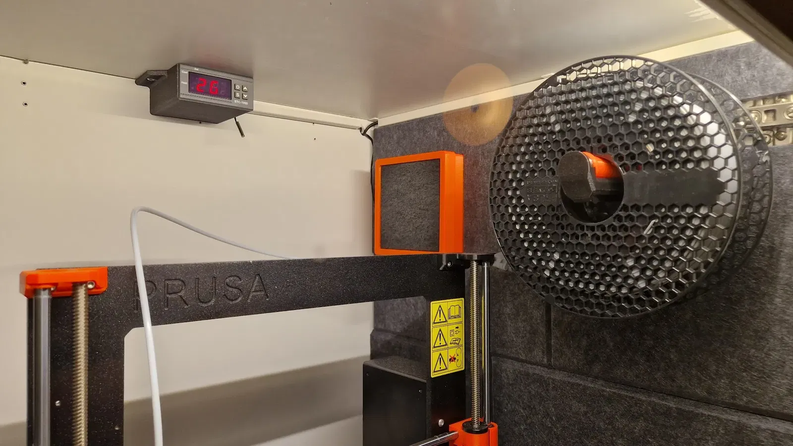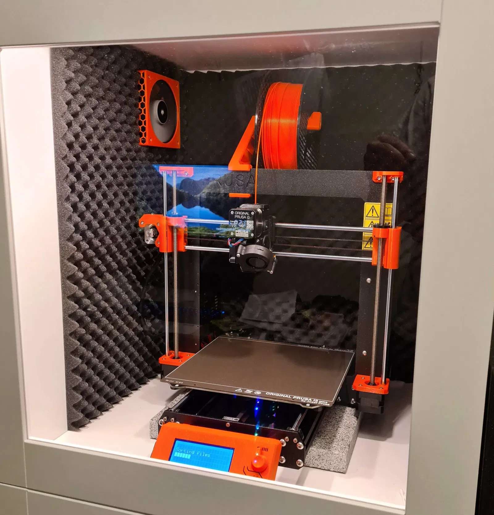 - Cắt một số vật liệu lọc và nhấn vào vị trí bằng nắp lọc. Sử dụng một bộ lọc có độ dày 8-15mm. Hiện tại tôi đang sử dụng một bộ lọc dày 15mm được nén vào vị trí bởi nắp lọc. Tôi đang nghĩ đến việc thêm một lớp lọc nữa cho các hạt nhỏ hơn nhưng quạt đang gặp khó khăn trong việc đẩy không khí qua nó như hiện tại. Quạt cần phải chạy ở tốc độ tối đa trong trường hợp của tôi để có thể tạo ra lưu lượng qua bộ lọc. Nhưng có vẻ như đủ để loại bỏ mùi PLA trong phòng của tôi với quạt và thiết lập PSU hiện tại. Để xây dựng vỏ IKEA Platsa, ### Hướng dẫn in In bằng Prusament màu cam với lớp 0.2mm. “Nắp lọc bên trong” được thiết kế cho lớp 0.3mm. Chưa thử nghiệm in các phần khác với 0.3.
