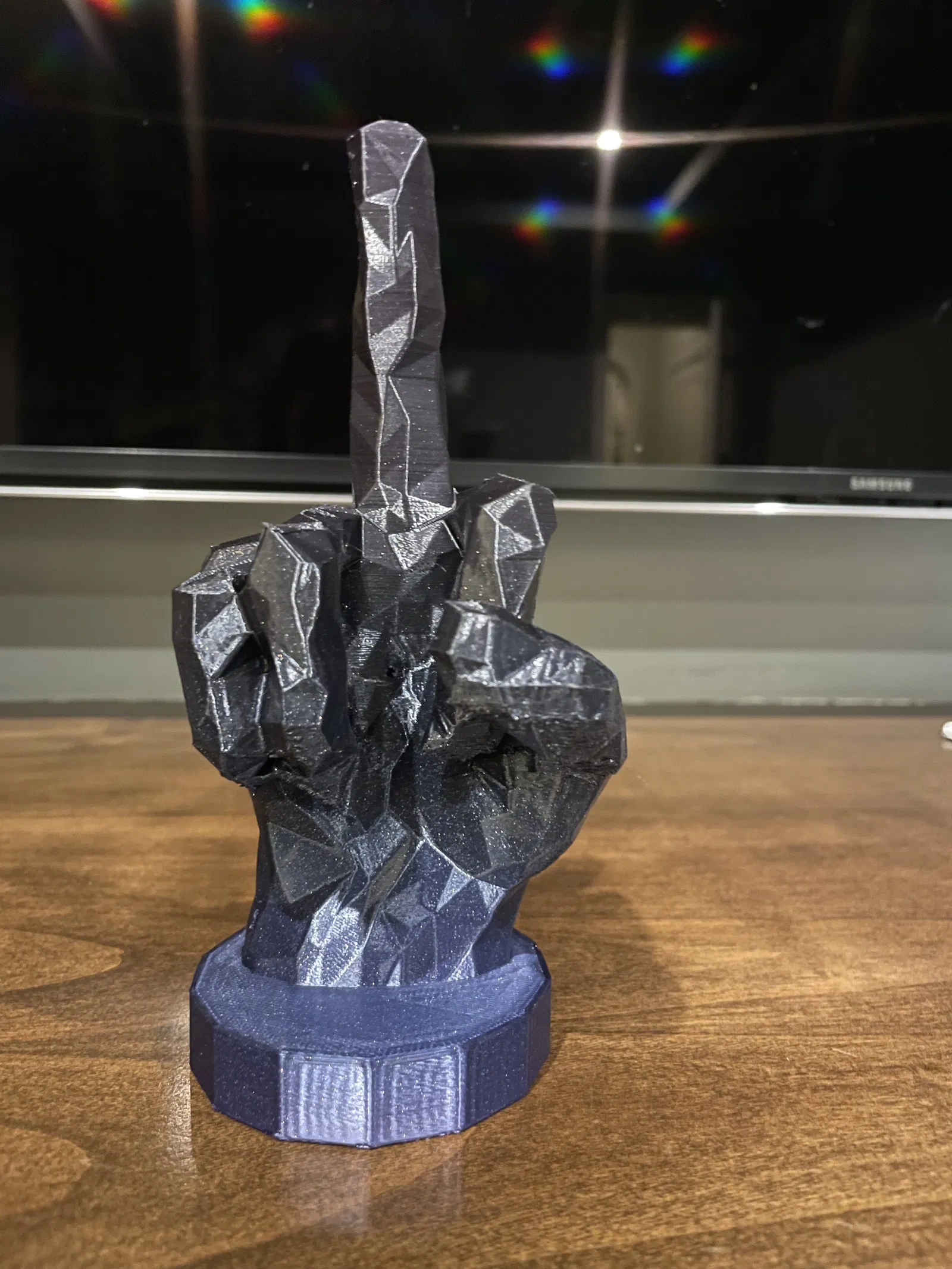 Mô hình ngón tay giữa low poly được gia cố bằng thanh thép 8mm x 155mm. Thiết kế này đảm bảo độ bền cao, chống gãy tốt, phù hợp cho những ai cần một món quà độc đáo và bền bỉ hơn phiên bản thường.
