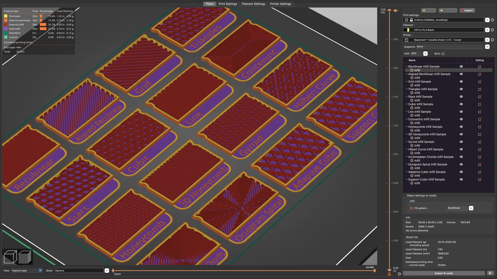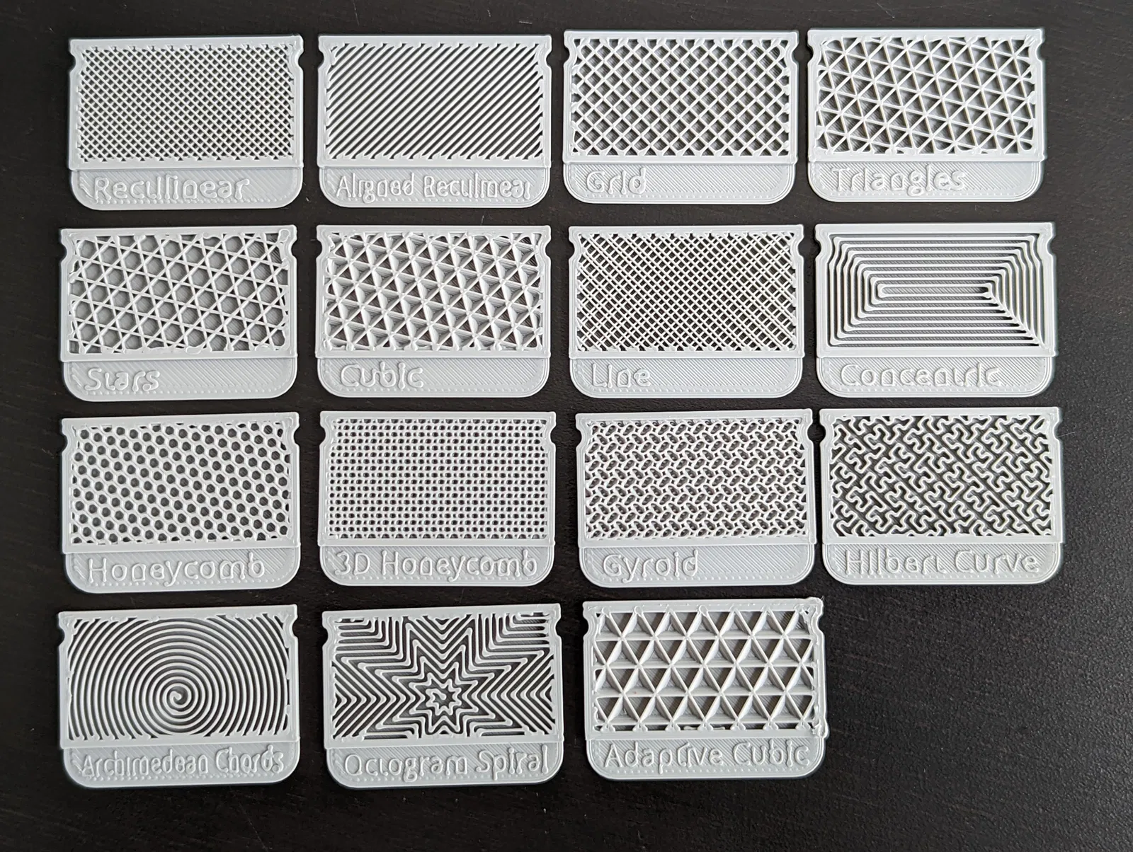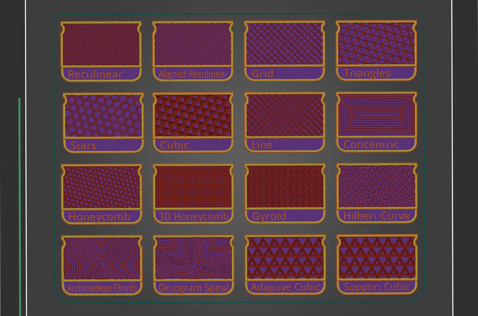 Recilinear, Aligned Rectilinear, Grid, Triangles, Stars, Cubic, Line, Concentric, Honeycomb, 3D Honeycomb, Gyroid, Hilbert Curve, Archimedean Chords, Octogram Spiral, Adaptive Cubic. Support Cubic