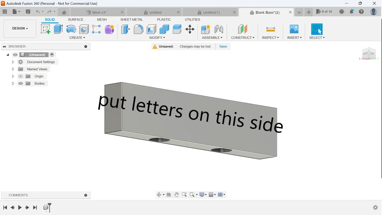 Một giá treo tường sử dụng các dải Velcro lớn thay vì đinh vít. Để tạo văn bản tùy chỉnh, hãy mở tệp Blank Base trong Fusion 360 và tạo một bản phác thảo, sau đó căn giữa văn bản với mô hình và đùn hoặc cắt các đầu cho phẳng. BÂY GIỜ SPINNING v2 và Record_Holder_w_holes có thể được in ở độ cao lớp 0.28 và 20% độ đầy. Pin V3 cần được in ở độ cao lớp 0.2 và 100% độ đầy.