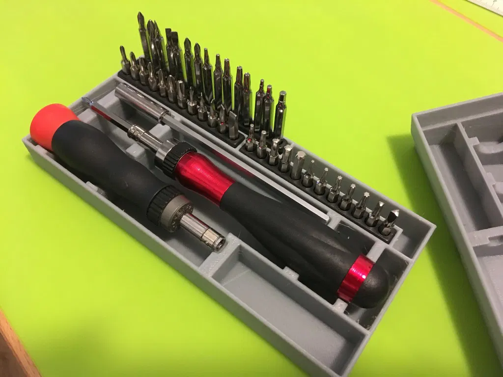 Tui làm cái hộp này để đựng mấy cái tua-vít nhỏ của tui. Nó đựng được bộ tua-vít cóc hiệu Trojan rẻ tiền (bit 30mm, tua-vít và cây nối dài) với một cái tua-vít cũ mà tui không biết hiệu gì (bit 45mm và tua-vít). In nắp úp xuống để tiết kiệm support.