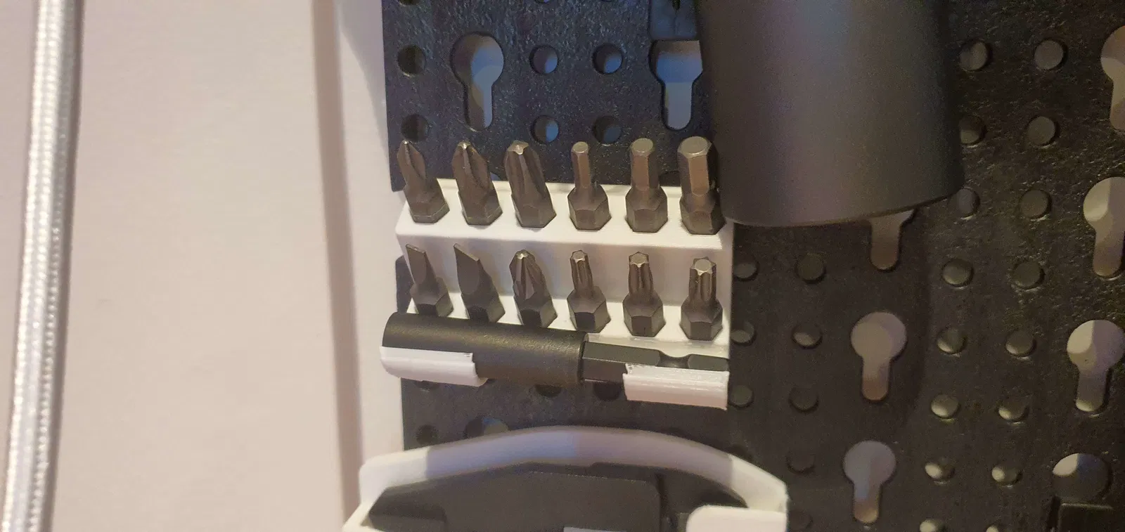 Cái này là kệ giữ mũi tua vít điện, thiết kế để gắn lên bảng treo (pegboard) của các hãng Lidl, Parkside, hay Horusdy. Nhỏ gọn, tiện lợi, giúp bạn sắp xếp mũi tua vít gọn gàng, dễ lấy khi cần làm việc.