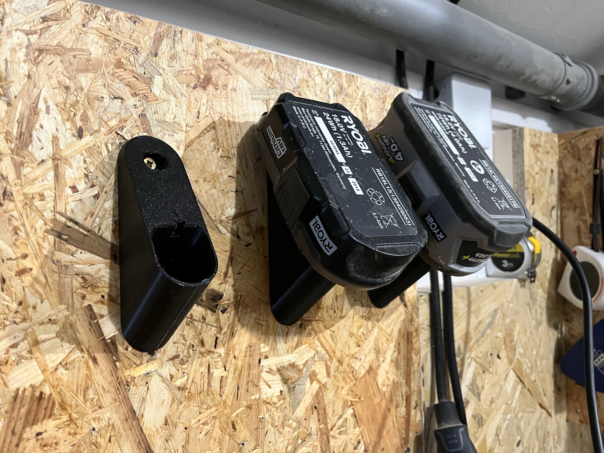 Giá đỡ pin cho dụng cụ Ryobi ONE+. Model được thiết kế tập trung vào việc in ấn đơn giản và nhanh chóng - thời gian in không quá 3 giờ. Để cố định, sử dụng 2 vít gỗ có đường kính 3,5 - 4 mm. In không cần support, tốn 49 gam filament.