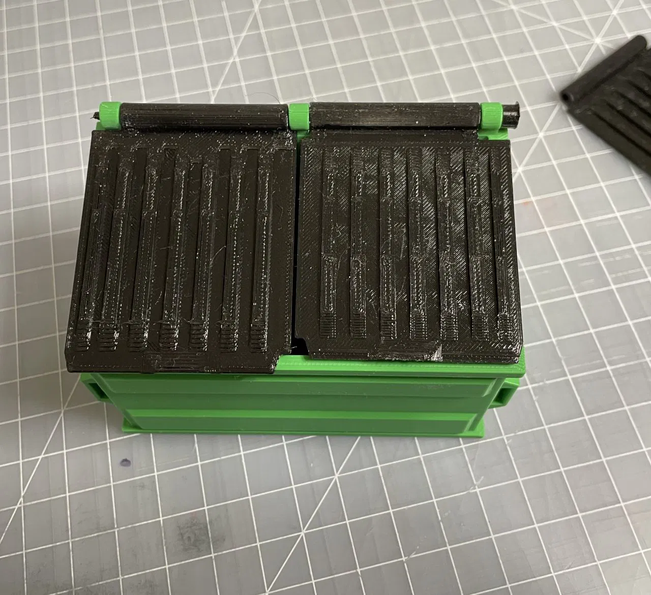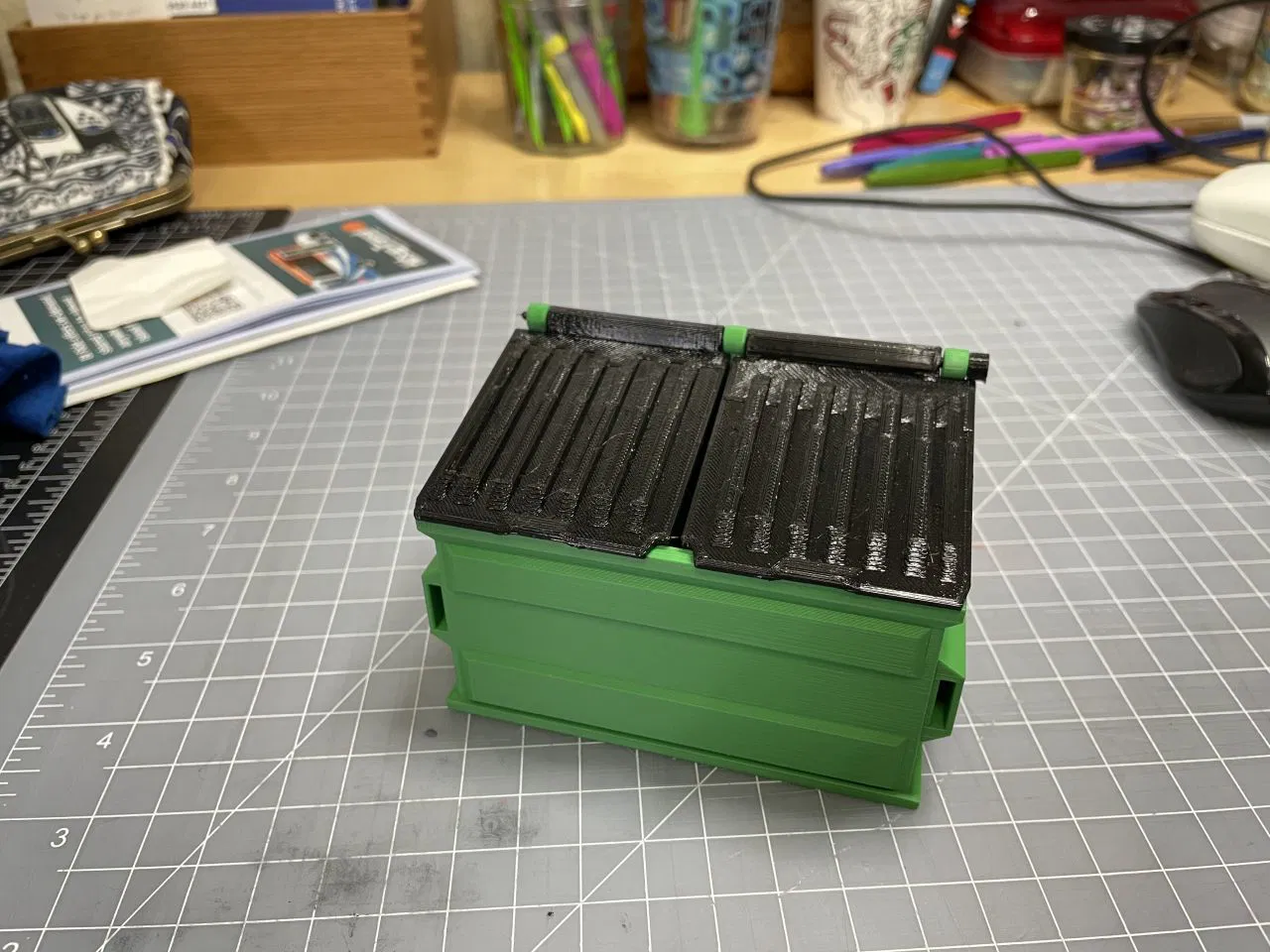Tui khoái cái mẫu Desktop Dumpster của Matthew Bogner lắm, mà tui muốn mấy cái nắp nó hơi nhô ra phía trước thùng rác chút xíu, cho nó dễ mở về phía sau hơn chút thôi. Sẵn tiện tui cũng bịt mấy cái khe hở gần bản lề lại luôn, theo sở thích cá nhân của tui thôi.