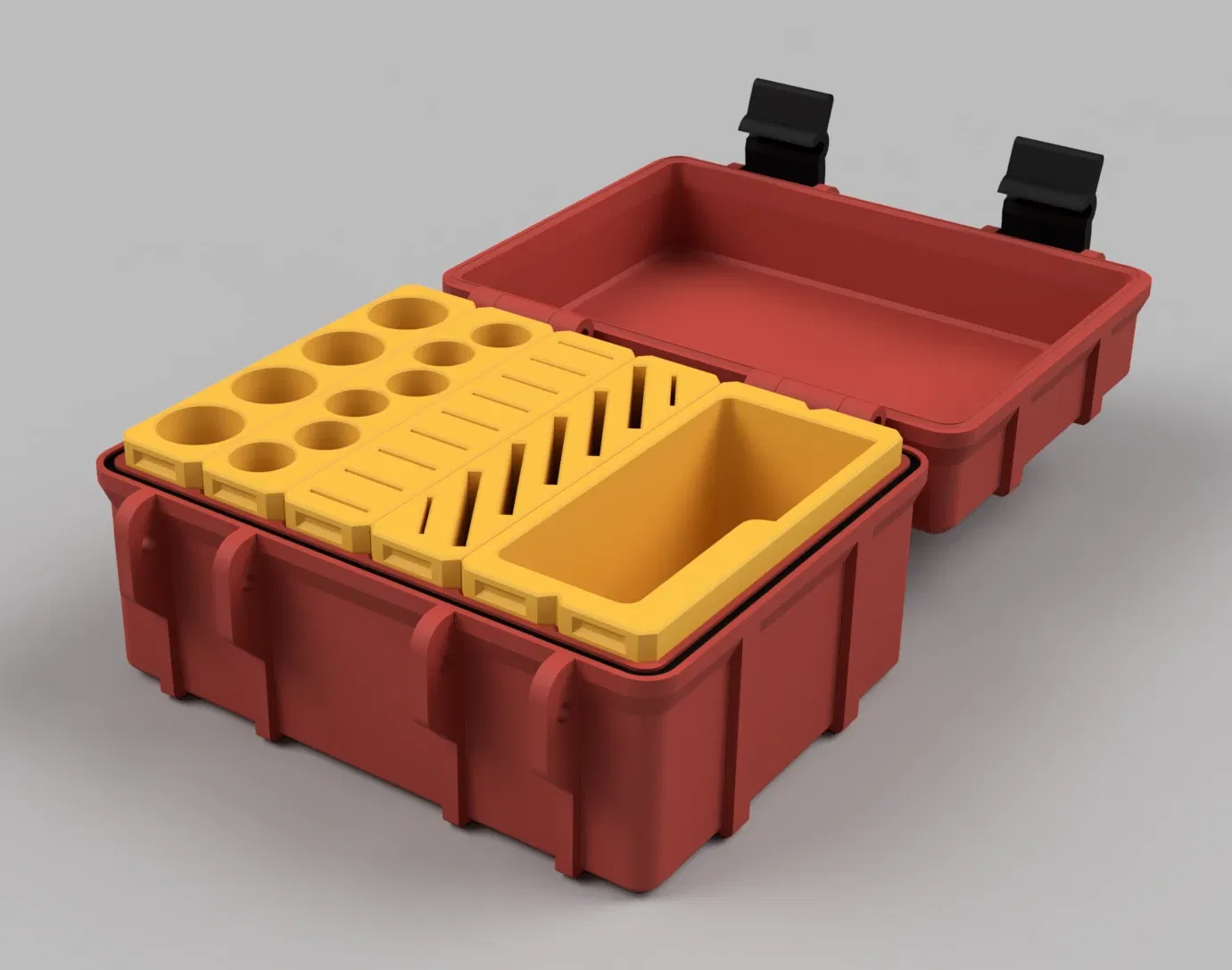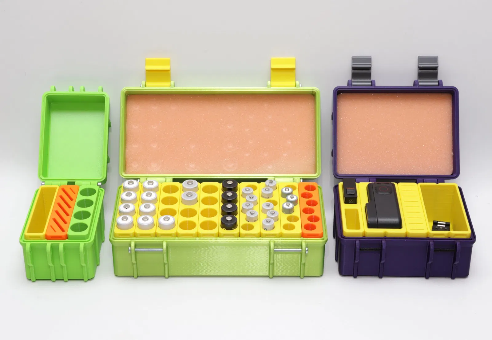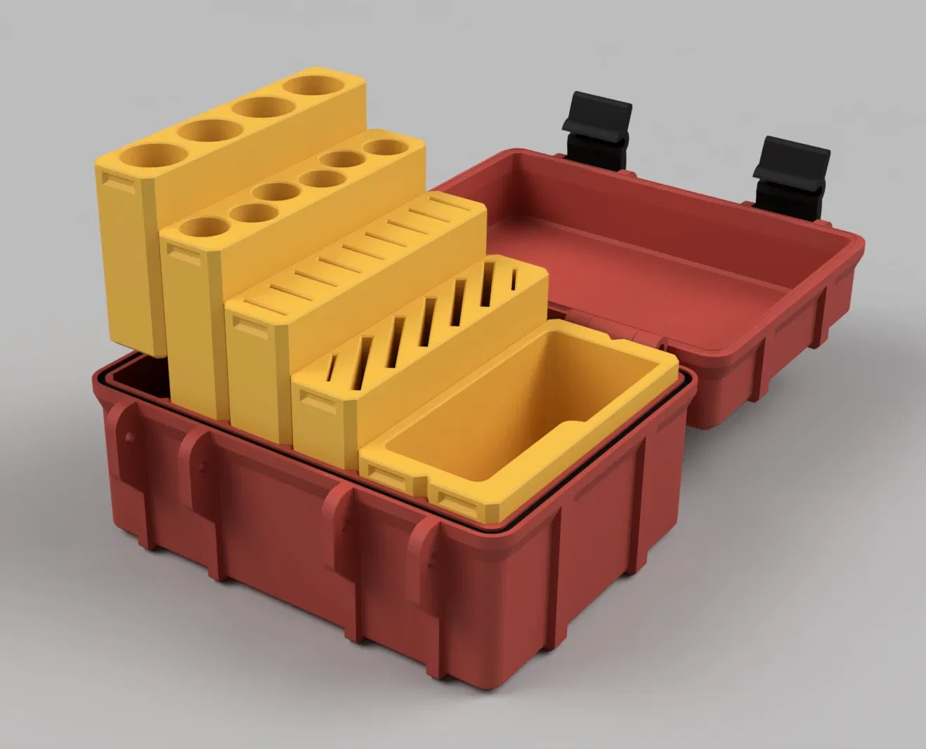 Hộp cứng có thể tùy chỉnh với các bộ chèn mô-đun, có thể sửa đổi trong Fusion 360. Bao gồm các bộ chèn cho pin, thẻ SD, đầu phun và hơn thế nữa. Yêu cầu vít M3 để lắp ráp. Phiên bản này có chiều cao khe cắm tiêu chuẩn.