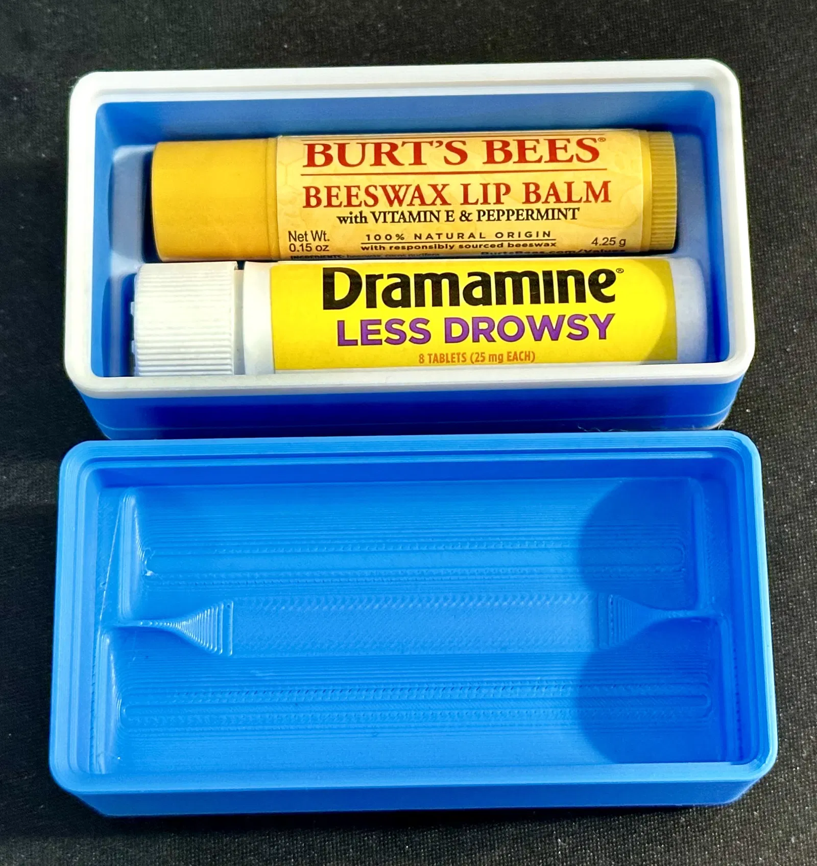 Đây là cái hộp Gridfinity đựng son dưỡng môi và thuốc Dramamine, làm chung một cái luôn nha!