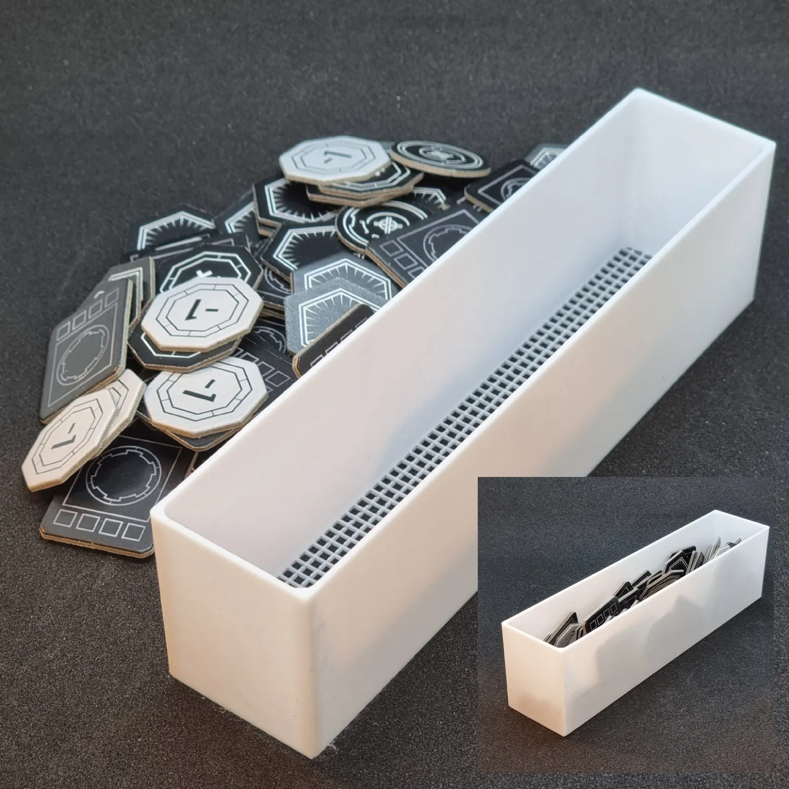 Nếu bạn muốn giữ nguyên hộp chèn gốc, bạn chỉ cần in phần nắp để ngăn các token bị đổ ra khỏi ngăn chứa.
