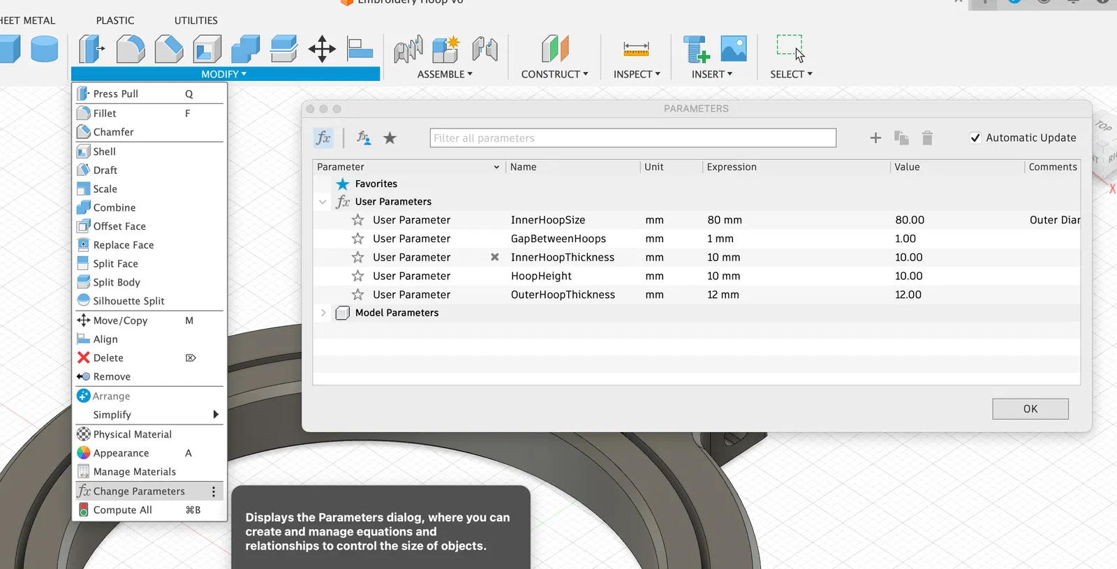 Mô hình Fusion360 gốc đã được tham số hóa để cho phép thay đổi các kích thước khác nhau của khung (xem hình ảnh đính kèm để biết những gì có thể thay đổi). Nếu bạn không quen với Fusion 360 có tham số, có một hộp thoại dưới "Modify" gọi là "Change Parameters". Các giá trị có thể được thay đổi trong hộp thoại và mô hình sẽ cập nhật theo thời gian thực.