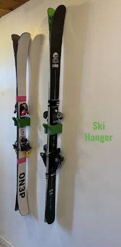 Giá treo ván trượt tuyết giữ ván trượt bằng cách đặt phần gắn vào giá đỡ. Dùng 2 vít chìm #8 bắt vào thanh đỡ tường. Dùng vật liệu ABS với 3 lớp tường và 20% mật độ ruột (infill) hoạt động rất tốt.