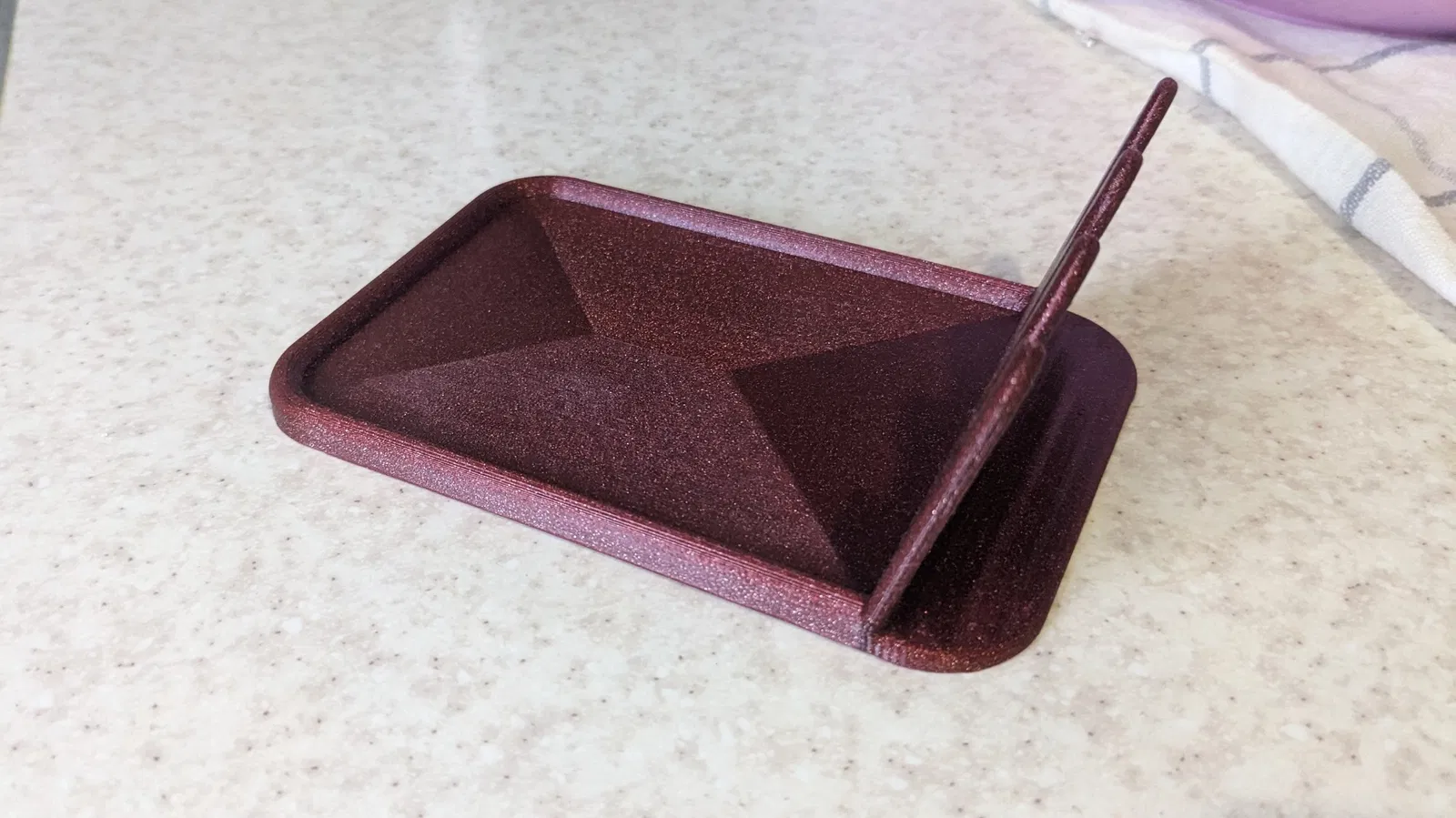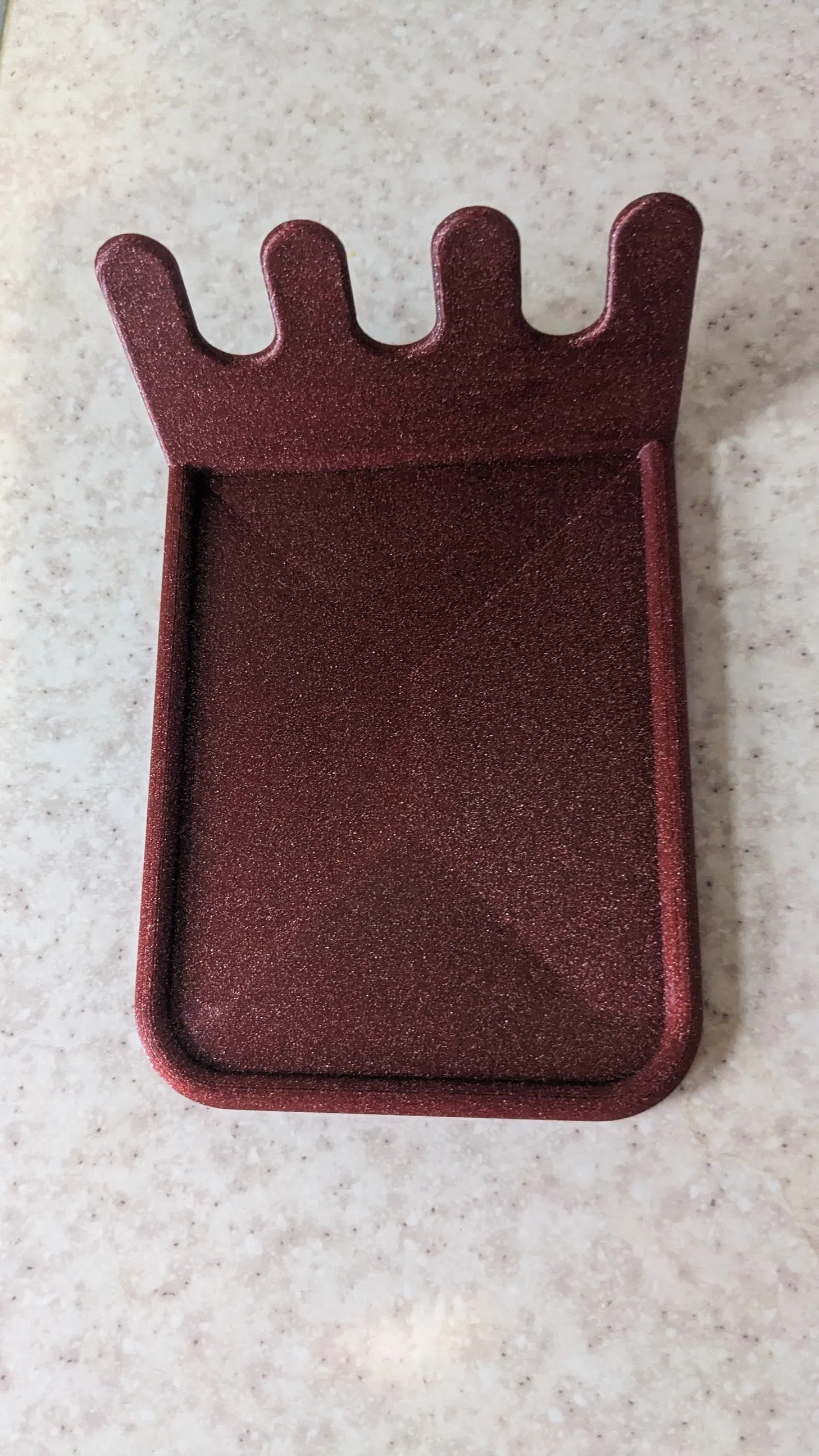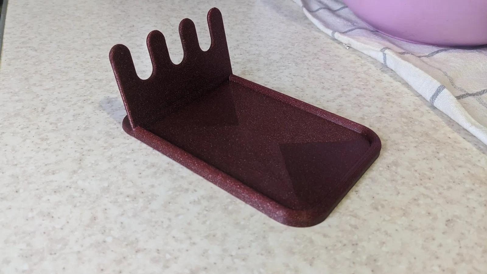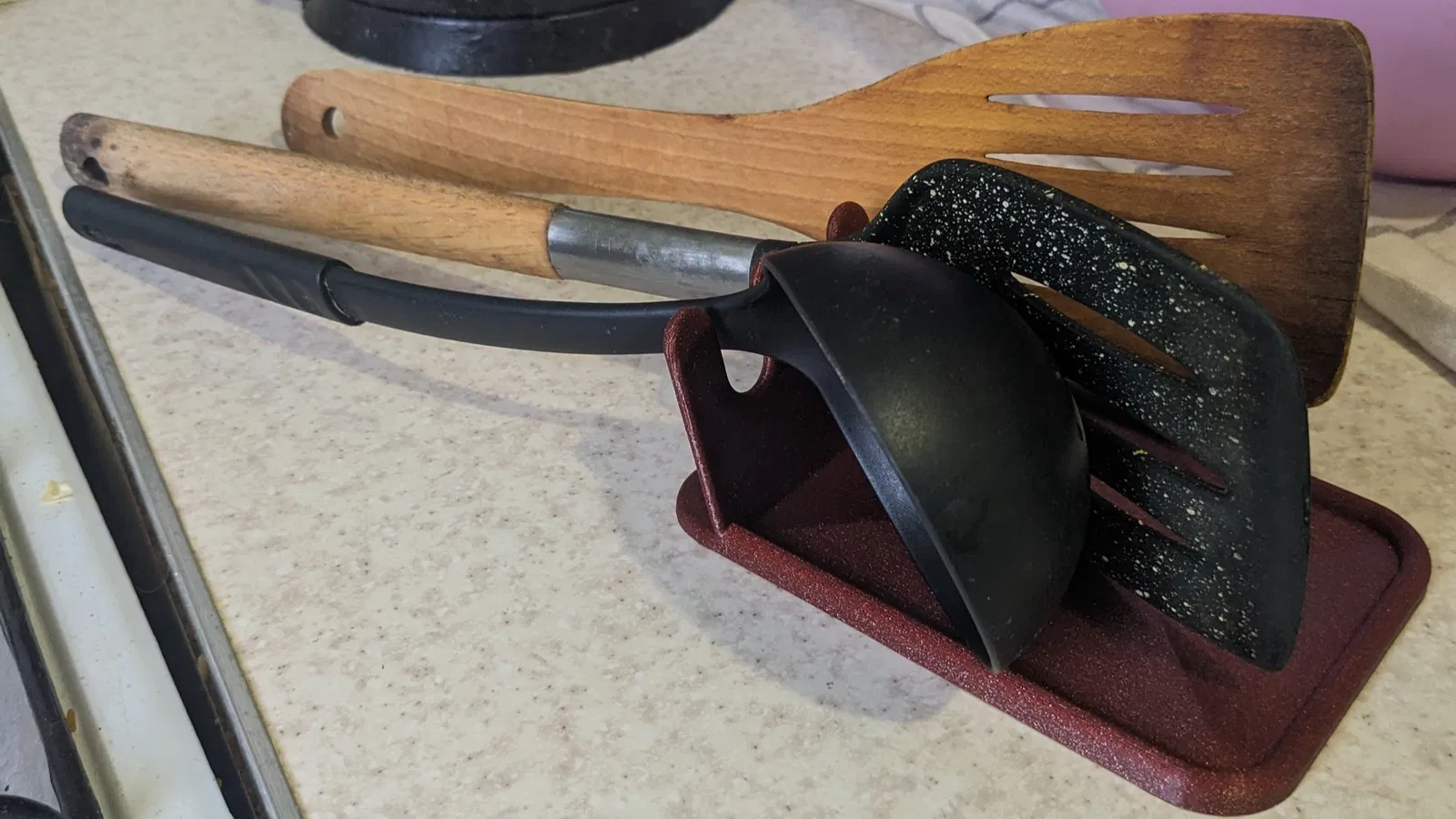 Chỗ gác cho dụng cụ nhà bếp. Giữ muỗng và vá cách xa mặt bàn. Đây là bản remix, có file FreeCAD gốc kèm theo, dài 140mm và rộng 95mm, có 3 khe để đồ.