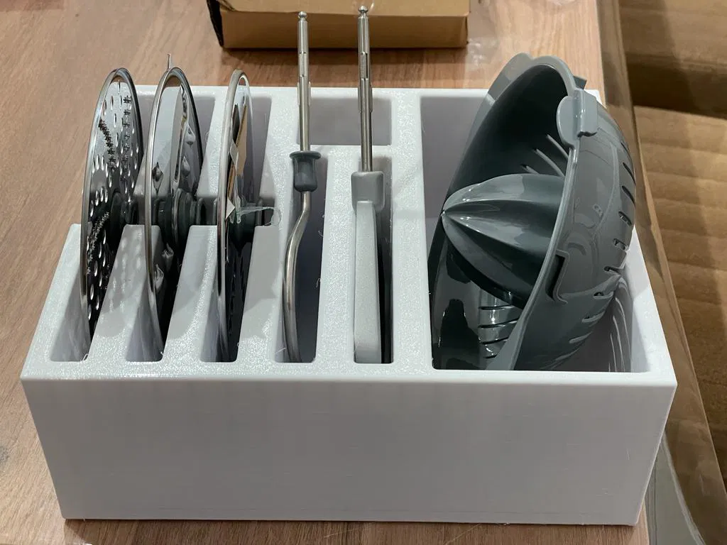 Bộ tổ chức này được thiết kế để sắp xếp gọn gàng các phụ kiện đi kèm với máy làm bột Kenwood, giúp bạn dễ dàng tìm kiếm và sử dụng chúng. Giải pháp lưu trữ đơn giản nhưng hiệu quả cho không gian bếp của bạn.