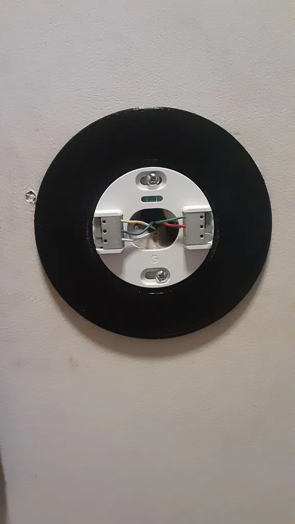 Ốp Tường Google Nest Thermostat. Tháo nhiệt kế thông minh ra và lắp xung quanh đế (không cần tháo đế). Sản phẩm này sẽ che hết các lỗ cũ từ những loại nhiệt kế chữ nhật xấu xí cũ kia, trừ những lỗ đặc biệt.