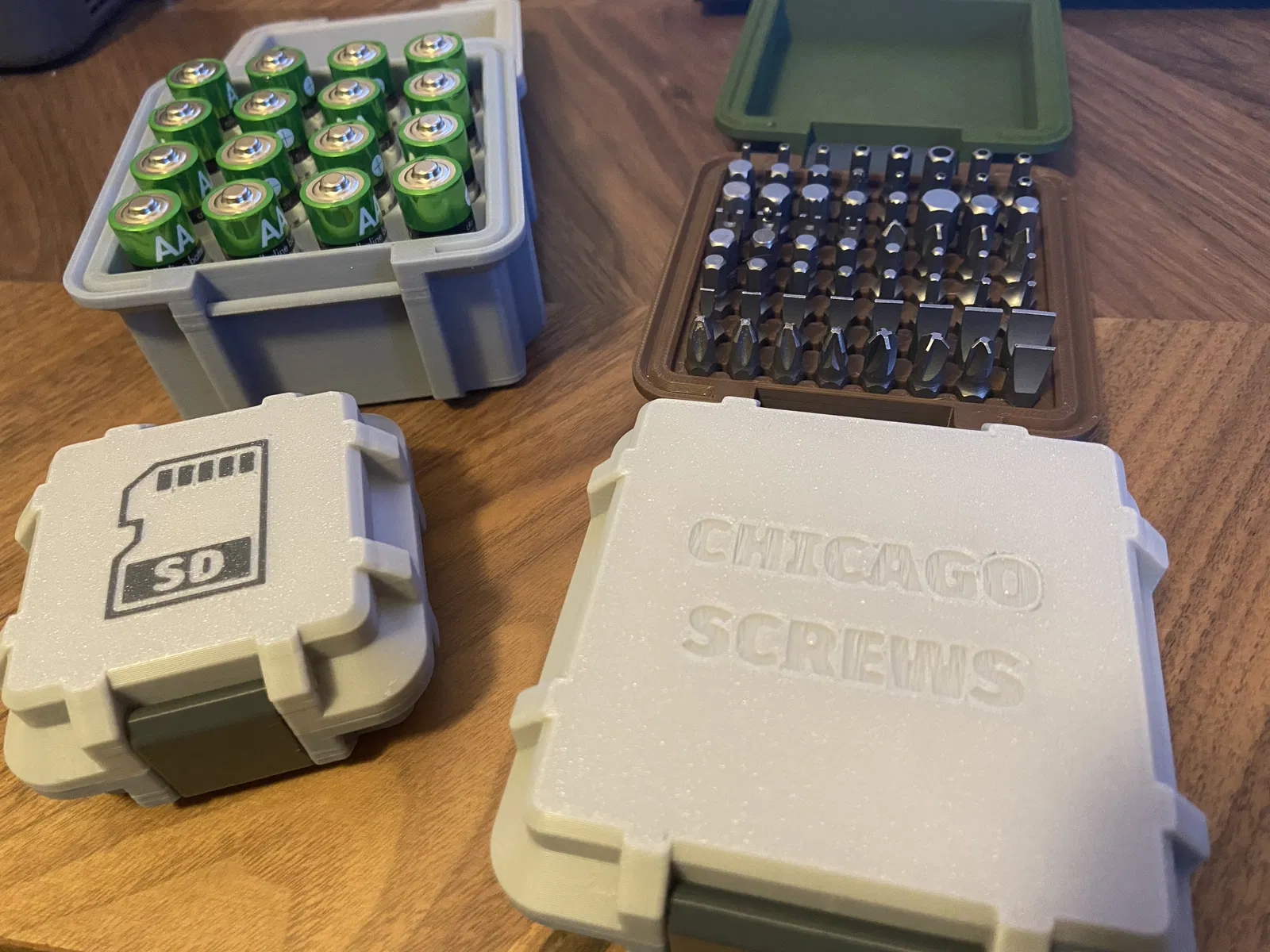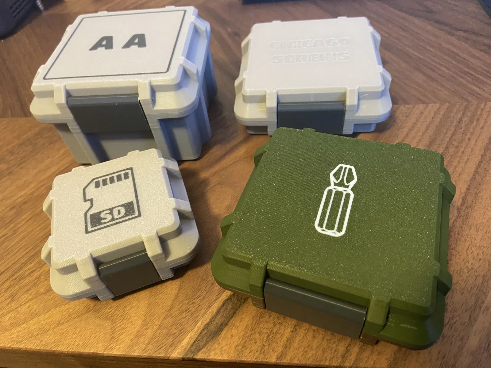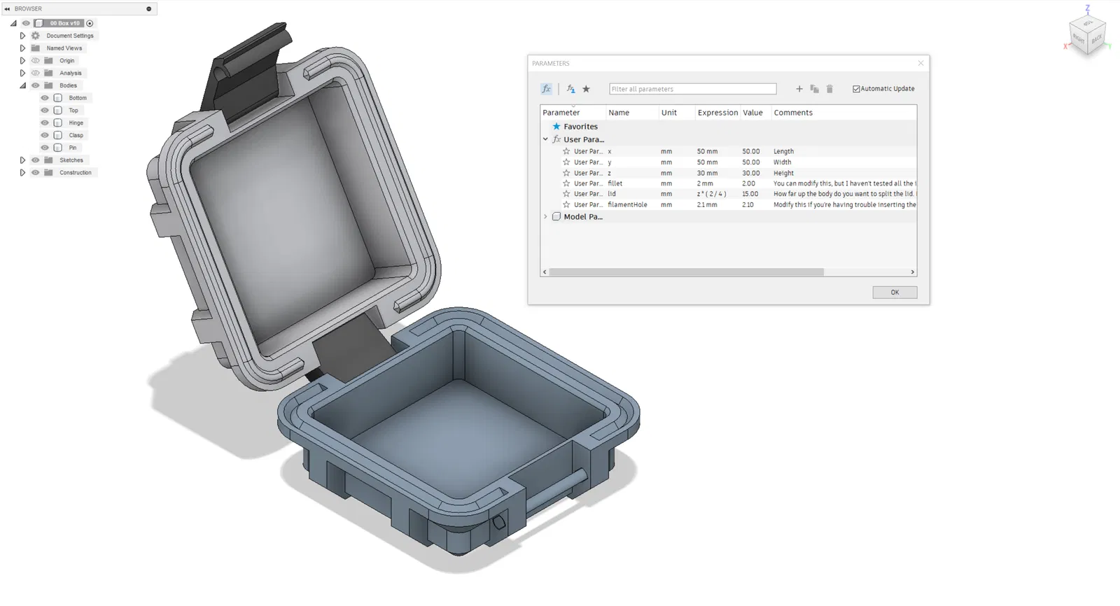 Phiên bản hộp parametric được cải tiến với bản lề và chốt tốt hơn. Hoàn toàn in 3D, không cần phần cứng. Cơ chế bản lề khớp nối đôi và chốt được in riêng để tăng độ bền. Kích thước lỗ filament có thể tùy chỉnh.