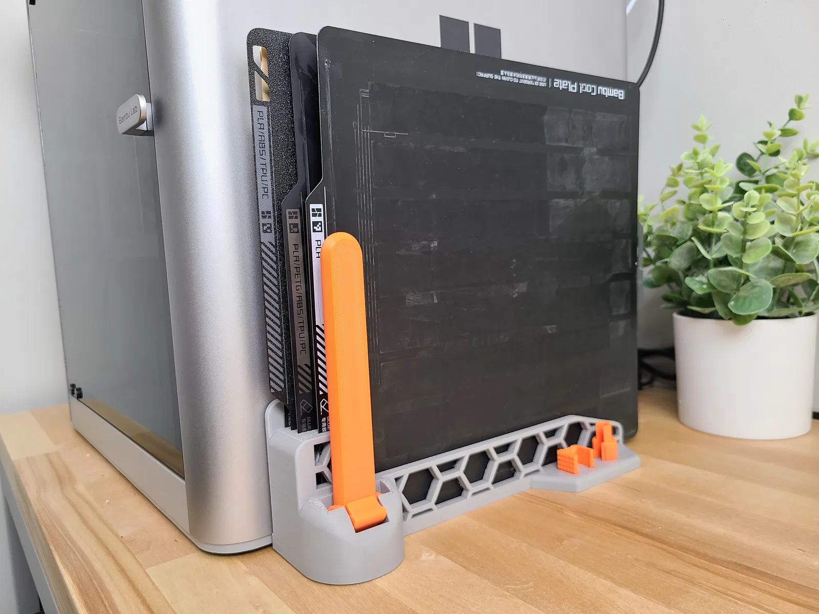 Đây là một lựa chọn đẹp mắt và tiết kiệm nhựa in cho giá đỡ tấm thép/khay in của máy Bambu Lab (X1C, X1, P1P). Nó có sức chứa lên tới 4 tấm hoặc 3 tấm và một khe cắm cho sticker khay in. Ngoài ra còn có chỗ để cất giữ dụng cụ cạo BL và dụng cụ ngắt kết nối AMS.