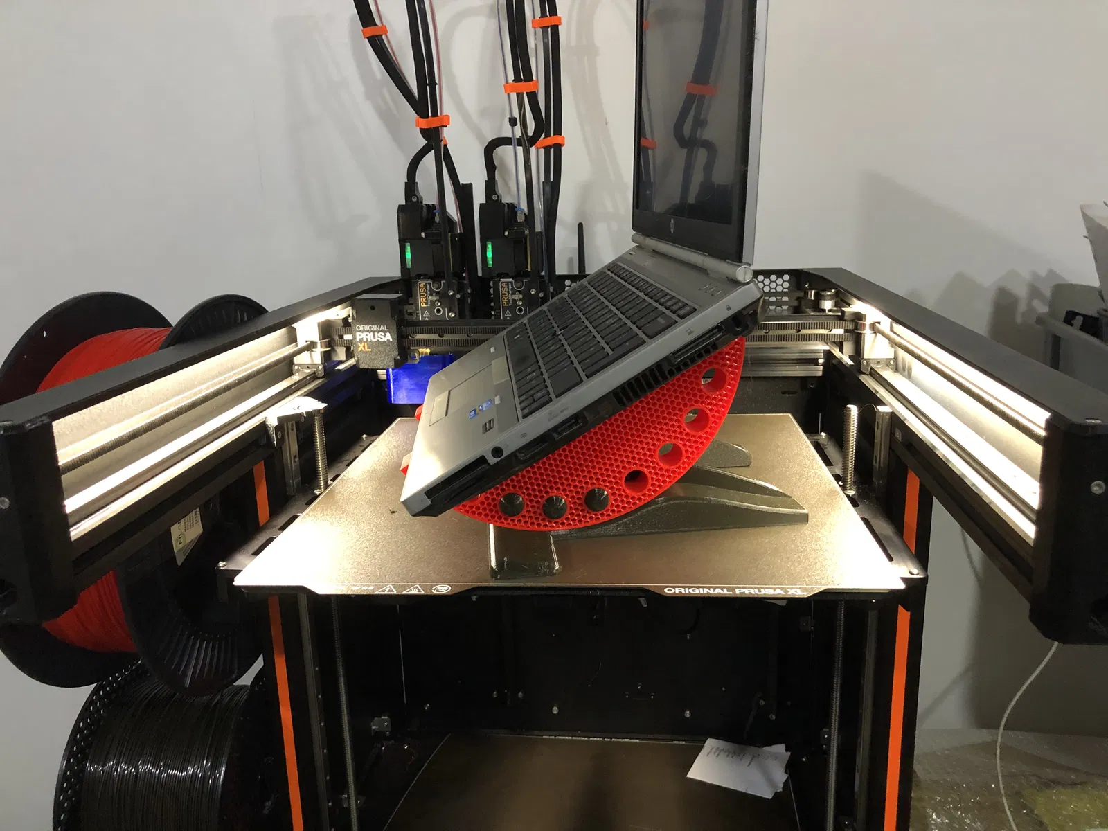 Giá đỡ laptop điều chỉnh được, có thể dùng làm giá treo tường. Có 3 góc nghiêng, 2 lỗ bắt vít tường và 3 lỗ cho chân đế 8mm. Có thể in trên máy XL hoặc Mini. Cần in 2 cái cho phần trên và thiết lập chế độ in tổ ong.