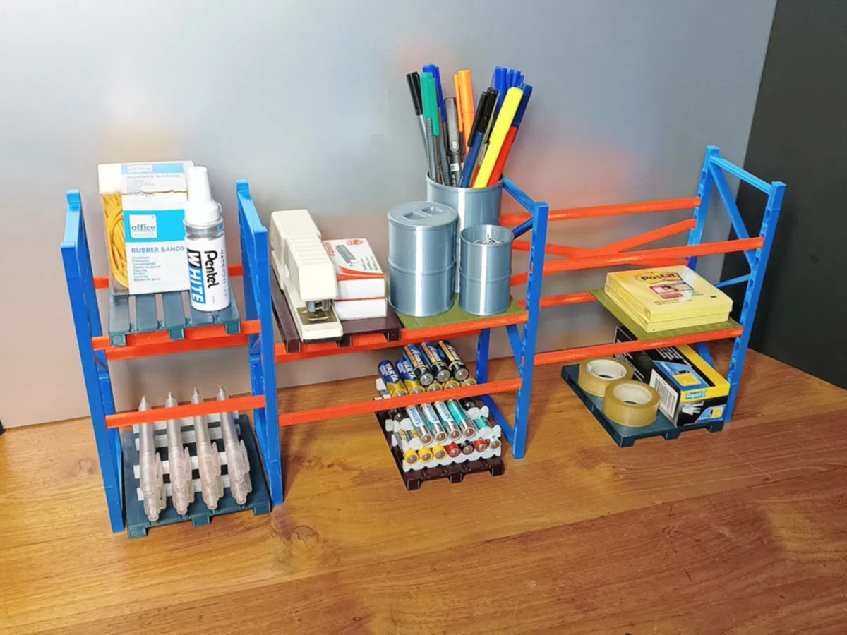 Tôi đã nghĩ ra một phiên bản thu nhỏ của các kệ pallet được sử dụng trong kho của chúng tôi để lưu trữ vật tư văn phòng. Vì tôi không tìm thấy các mô hình đã xuất bản có thể lắp ráp mà không cần vít hoặc có tỷ lệ phù hợp, tôi đã quyết định tự mình bắt đầu.