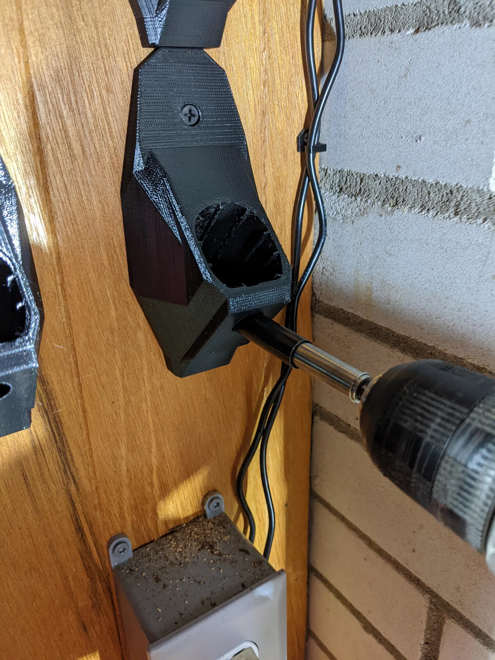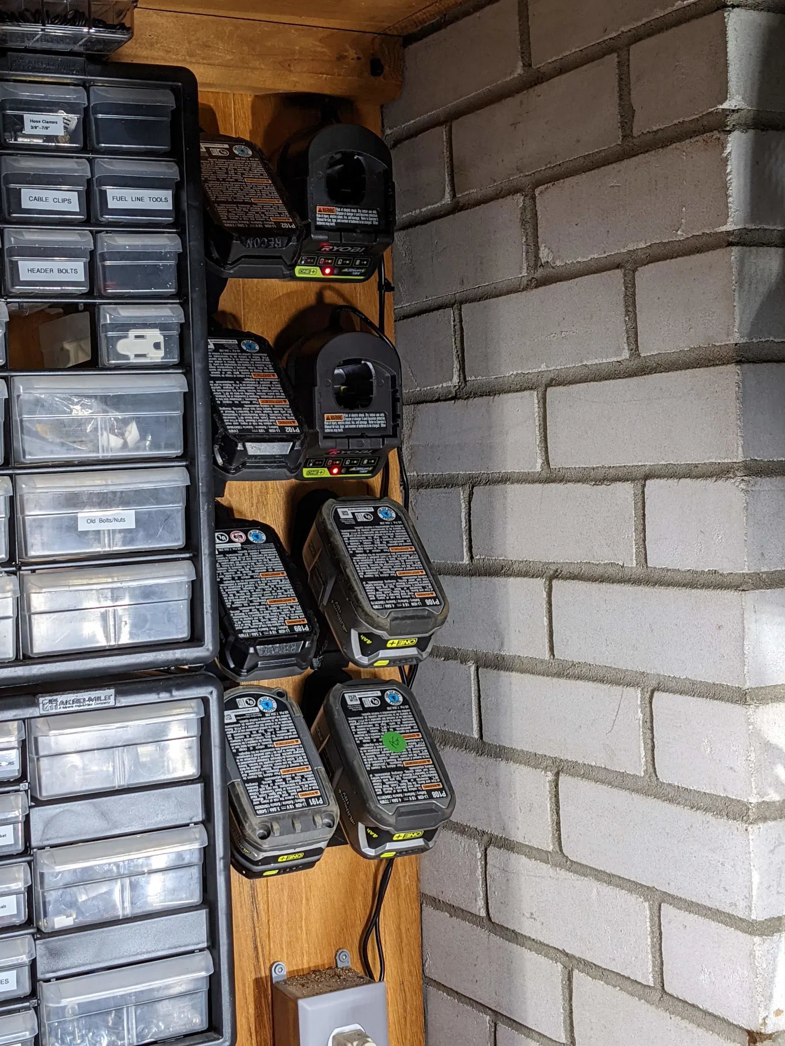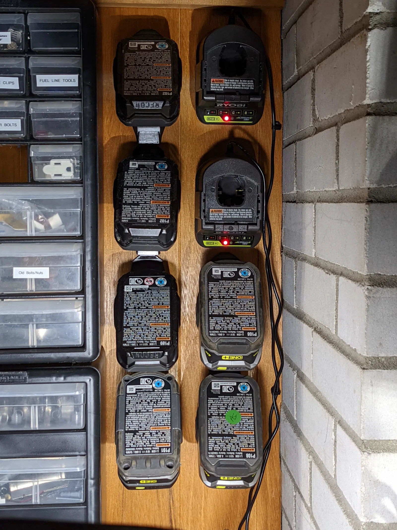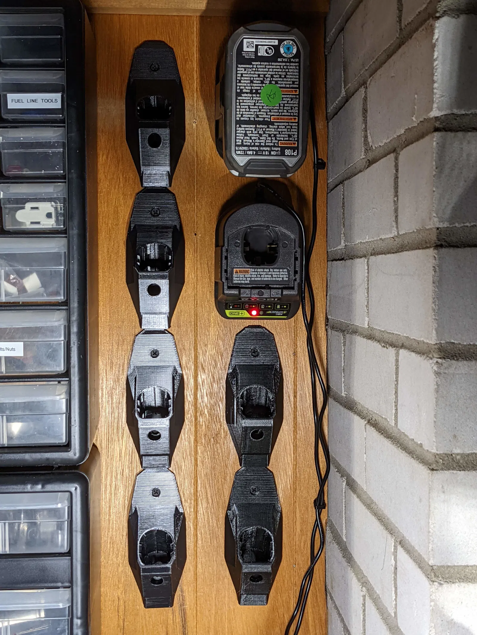Cái đế này được thiết kế để đựng pin Ryobi, trông xịn sò ngay cả khi để trống. Cấu trúc được gia cố giữ pin ở góc 45 độ, giúp pin trượt vào dễ dàng và gắn chặt vào tường luôn.