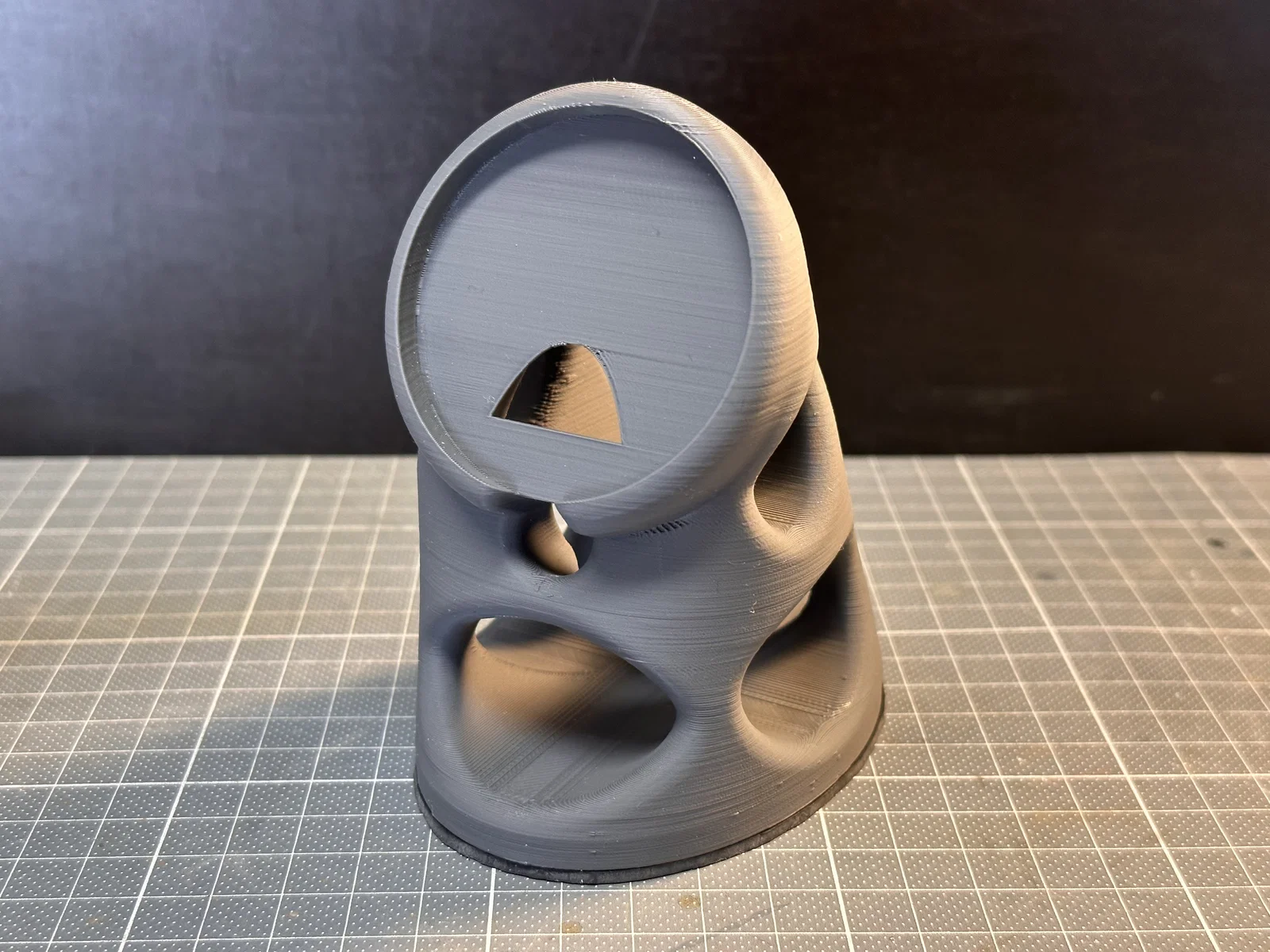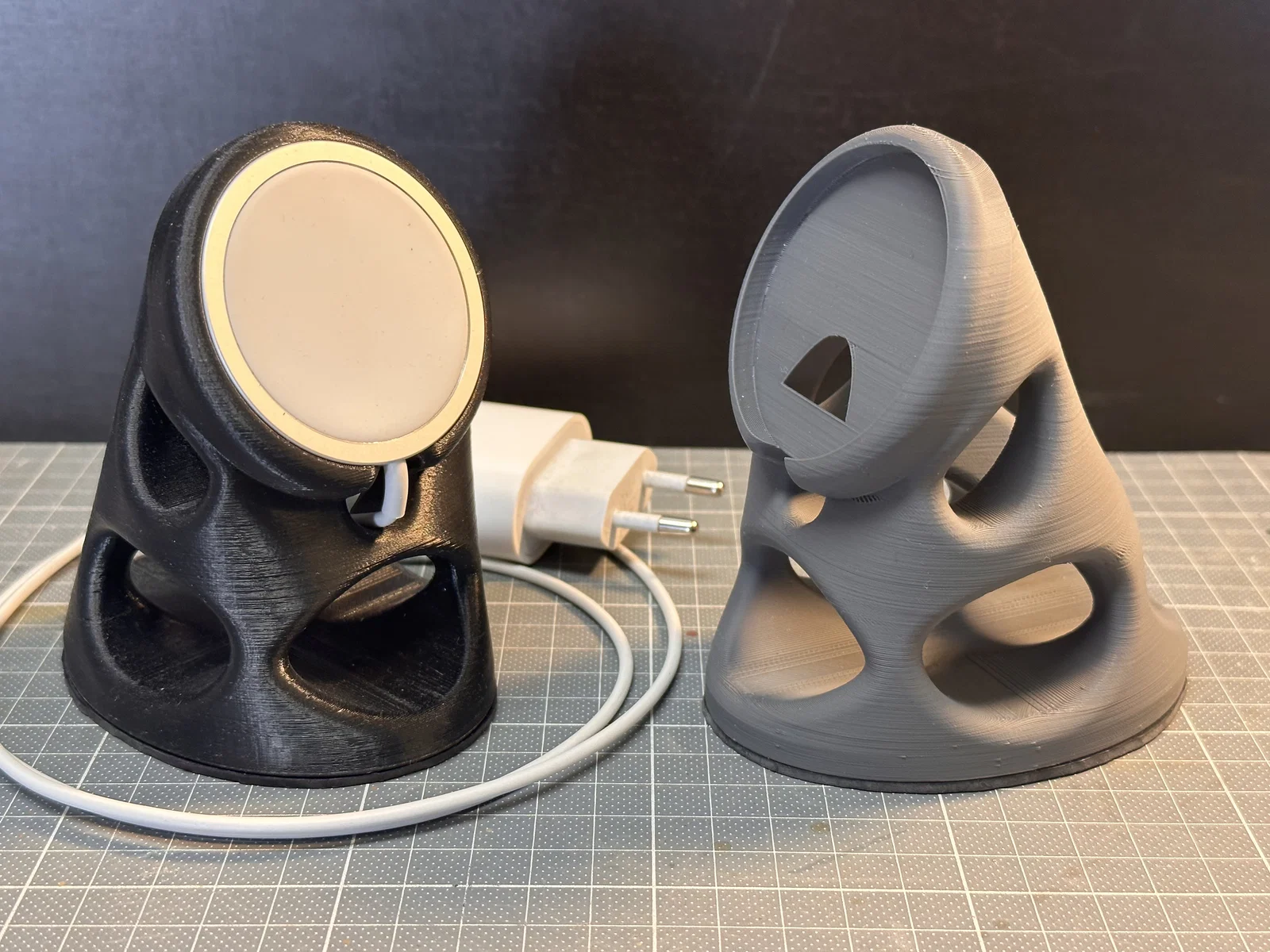 Tui in bằng hai cái máy in khác nhau, cái màu đen là tui xài ASA còn cái màu xám là tui xài PLA. Cái cục MagSafe thì lắp vô vừa khít cho cả hai cái luôn, không có bị gì hết. Tui có làm một cái lỗ phía sau để đẩy cục MagSafe ra nếu cần.
