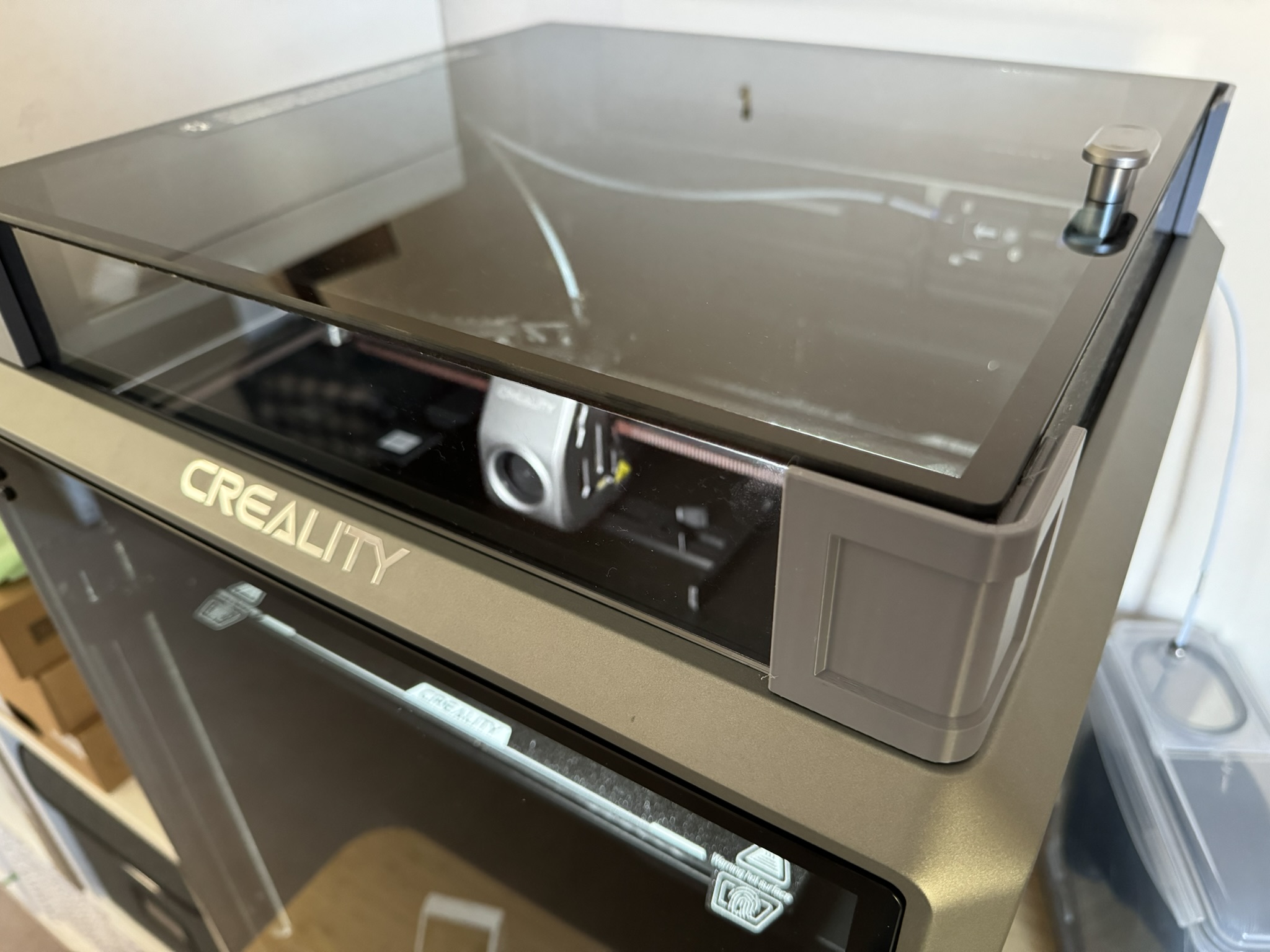 Bộ nâng này chống ống bowden cọ vào nắp kính. Phần hông bằng mica trong suốt giúp bạn nhìn thấy khu vực in. Phù hợp với Creality K1 Max, dùng vật liệu PLA, file STL.