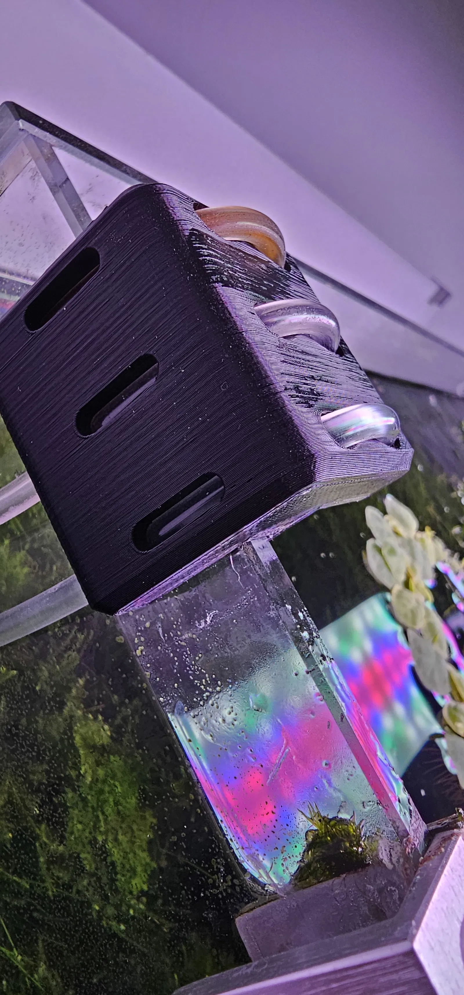 Cái kẹp ống châm phân zin nó hơi mỏng manh, với lại mau bị nghẹt do có nước ngưng tụ. Cái đế bằng phẳng của nó cũng có xu hướng hút mấy giọt nước nhỏ xíu tạt vô tới phía sau kính, lâu dần chảy xuống thành hồ, nhỏ xuống cái kệ của mình.