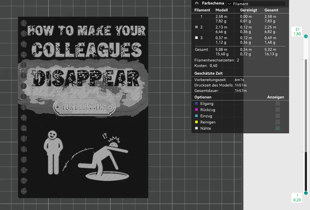 Bìa sổ tay DIN A6 độc đáo, giúp đồng nghiệp nhớ để bạn có không gian lên tiếng. Lần đầu thử nghiệm hueforge, in full lớp độn với cài đặt chi tiết. Hoàn hảo cho dân văn phòng 'khó ở'. Đừng quên đổi màu theo hướng dẫn để có sản phẩm ưng ý!
