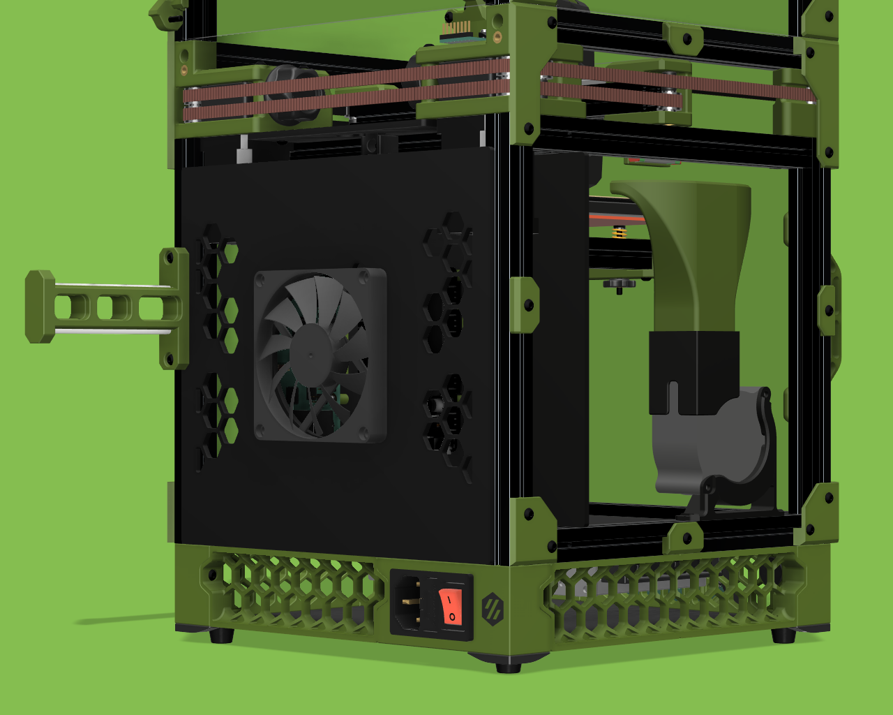 Cái quạt 30mm hiện tại để làm mát Raspberry Pi, bo mạch BTT pico và các driver stepper có thể không đủ nếu anh em muốn kín hoàn toàn cái V0.2 để in ABS, ASA hoặc Nylon với khoang nóng. Tôi đã thiết kế một tấm panel phía sau để lắp quạt 80x10mm 24V siêu êm, cái này sẽ đẩy gió tốt hơn vào khu vực điện tử. Nó có các lỗ hình lục giác ở hai bên cho phép khí nóng thoát ra.