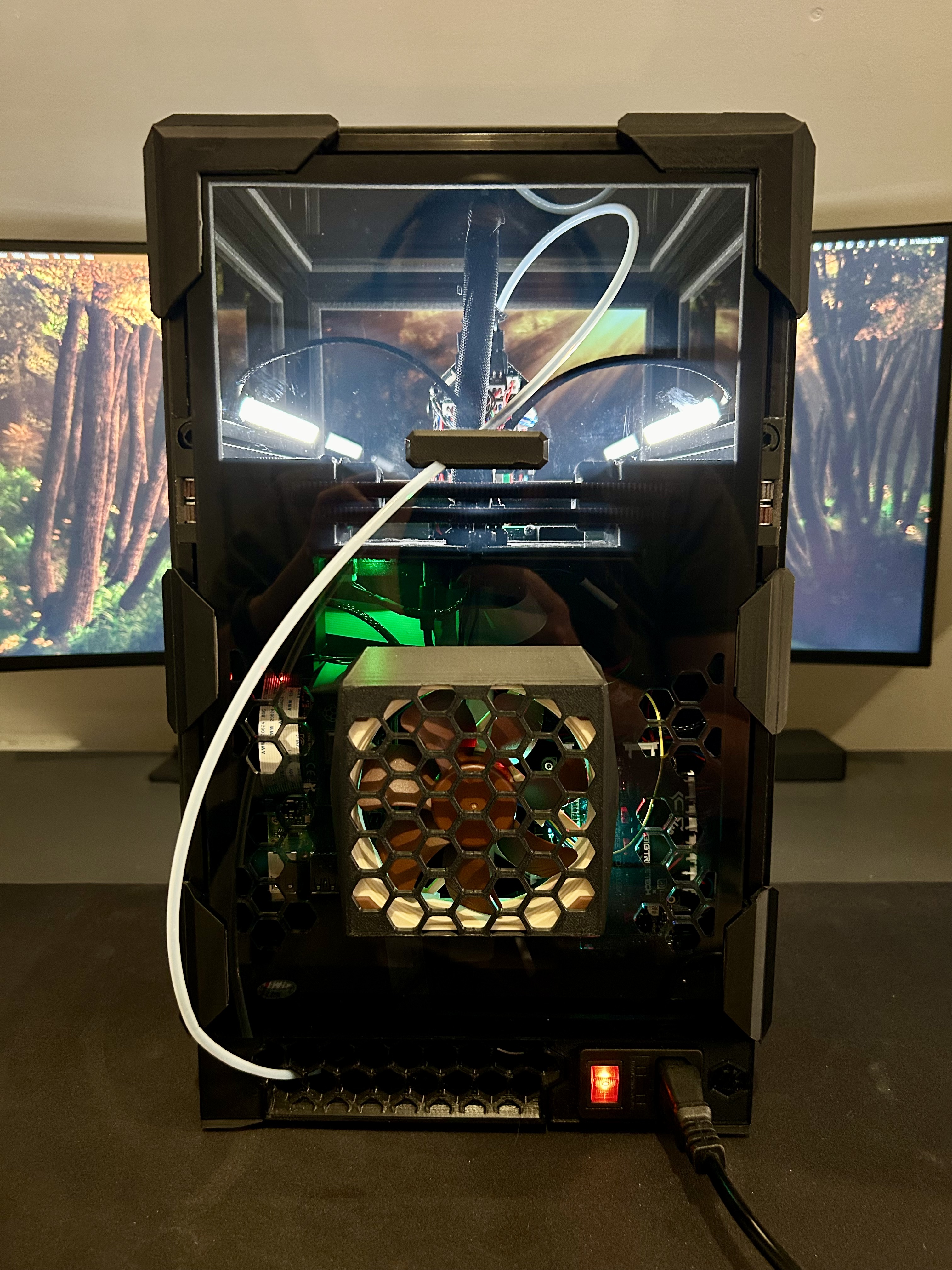 Có một cái quạt ở phía sau để làm mát bộ phận điện tử và một lối vào ống PTFE 2 góc ở các panel phía sau. Như vậy bạn có thể chọn vào từ bên trái hoặc bên phải. Khi một bên không được sử dụng, mình đã đặt một miếng ống PTFE nhỏ được hàn kín. Vì Tophat không còn được sử dụng như dự định, mình cũng đã bao gồm các camlock được remix lại trên ổ đĩa A/B. Như vậy bạn có thể khóa/mở nó theo cách tương tự như các bộ căng đai phía trước.