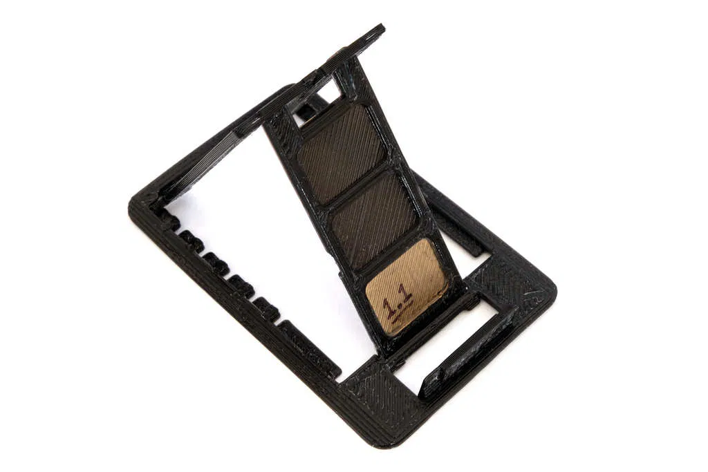 Giá đỡ điện thoại gấp gọn kích thước thẻ tín dụng, dày 2mm, in liền khối. Thiết kế dựa trên giá đỡ điện thoại này. Khe hở giữa các bộ phận được tăng lên 0.4mm và các khớp xoay được phóng to để thiết kế dễ in hơn, đáng tin cậy hơn với ít xử lý hậu kỳ hơn. Các cạnh được vát để dễ dàng bỏ vào ví mỏng.
