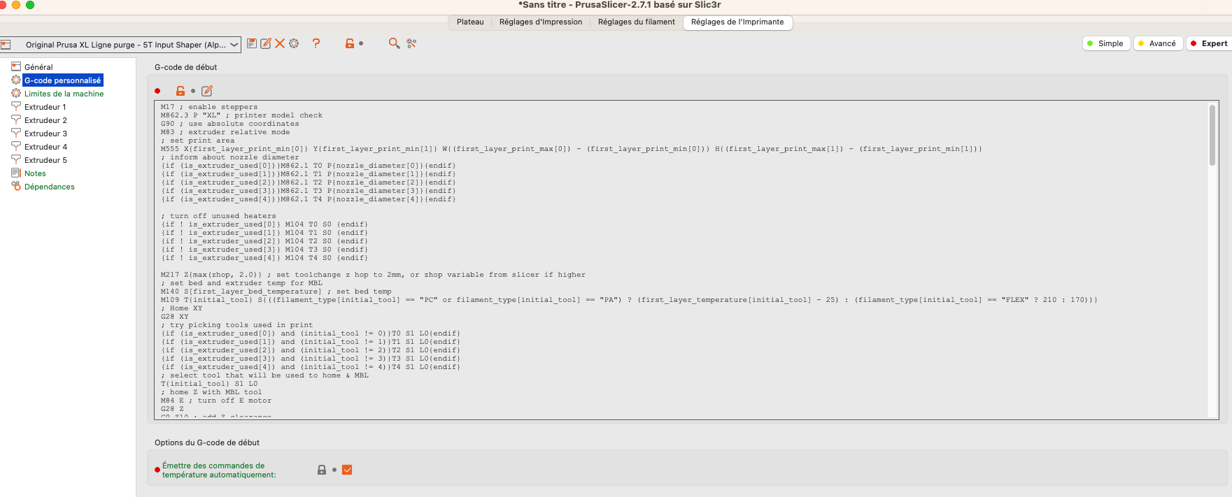 🇬🇧Here I decided to modify the start GCode of the Prusa XL 5 heads to be able to use the platter of your choice. The bleed line will be on the front of the plate, and no longer on the tabs.
