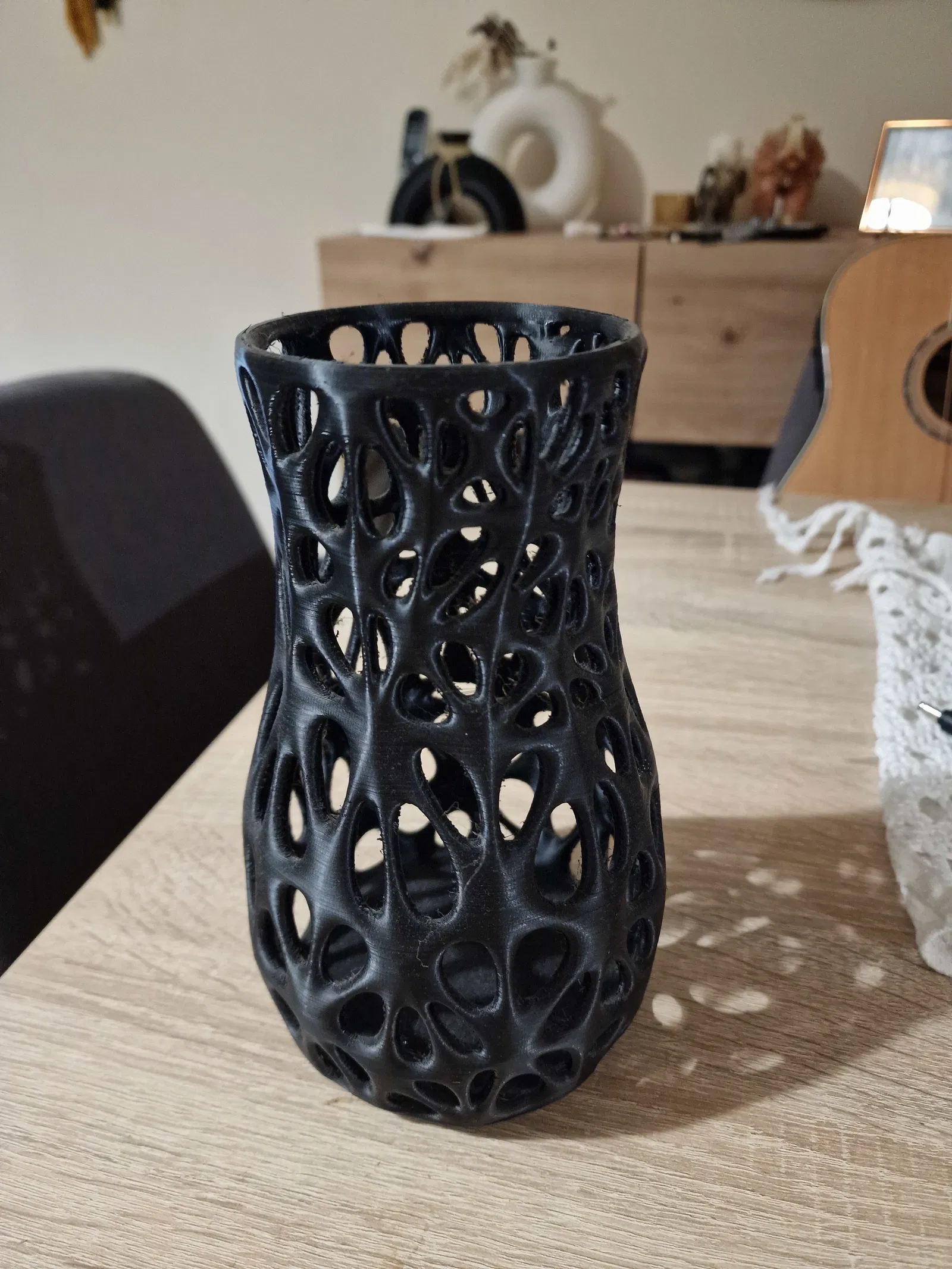 Cái bình hoa kiểu Voronoi này cũng là một bài kiểm tra độ giật/dây (stringing) cho máy của bạn đó, nên là chỉnh máy ngon lành trước khi in nha (không giống như cái bình mình in bị rớt bài kiểm tra luôn :P).