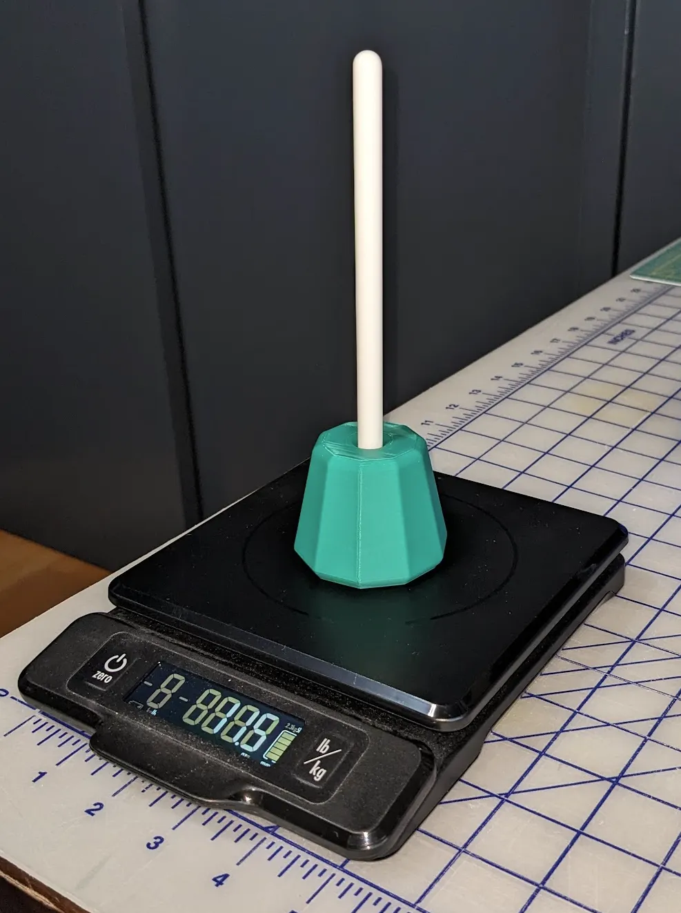 Tôi đã nghĩ đến nhiều cách để thêm trọng lượng, ban đầu thiết kế xung quanh các miếng chì hoặc vonfram rắn được chèn vào trong quá trình in, nhưng tôi muốn trọng lượng cảm thấy được phân bố đều trên toàn bộ sản phẩm nên tôi đã chọn viên chì #7.5 vì nó dễ tìm và rẻ. Thiết kế này sử dụng khoảng một pound. Ở các phiên bản trước, tôi đã thử tạm dừng quá trình in trước các lớp trên cùng và đổ viên chì từ trên xuống nhưng điều đó khá lộn xộn và tôi thường gặp phải tình trạng tách lớp tại chỗ tôi đã tạm dừng. Tôi đã thiết kế lại với một nút ở đáy có thể vặn vào. Tuy nhiên, tôi muốn bảo vệ bút khỏi bất cứ thứ gì được sử dụng làm trọng lượng, vì vậy điều đó dẫn đến thiết kế chủ yếu rỗng với một loại ống bao quanh bút.