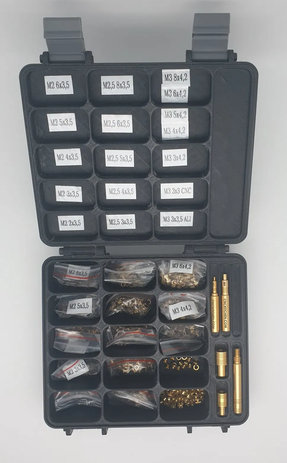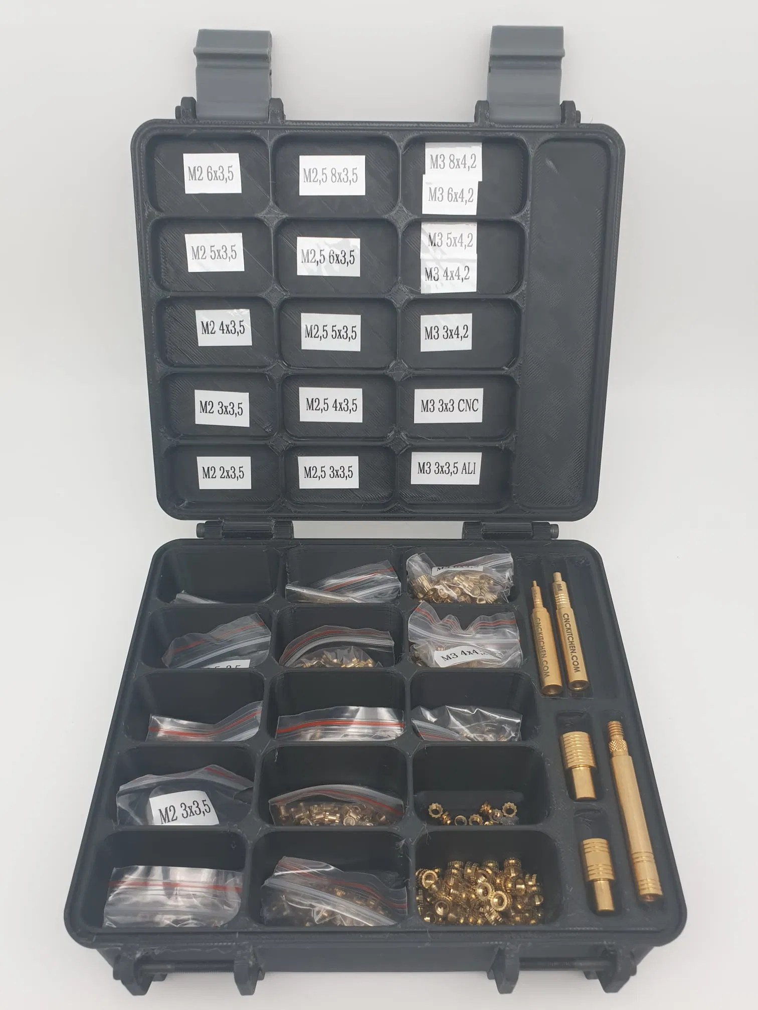 Hộp đựng ốc vít ren và dụng cụ lắp đặt CNC, có 15 ngăn. Thiết kế tùy chỉnh cho phép bạn dán nhãn từng ngăn. Chỉ cần 6 bu lông M3x30 để lắp ráp. In bằng PLA đen.