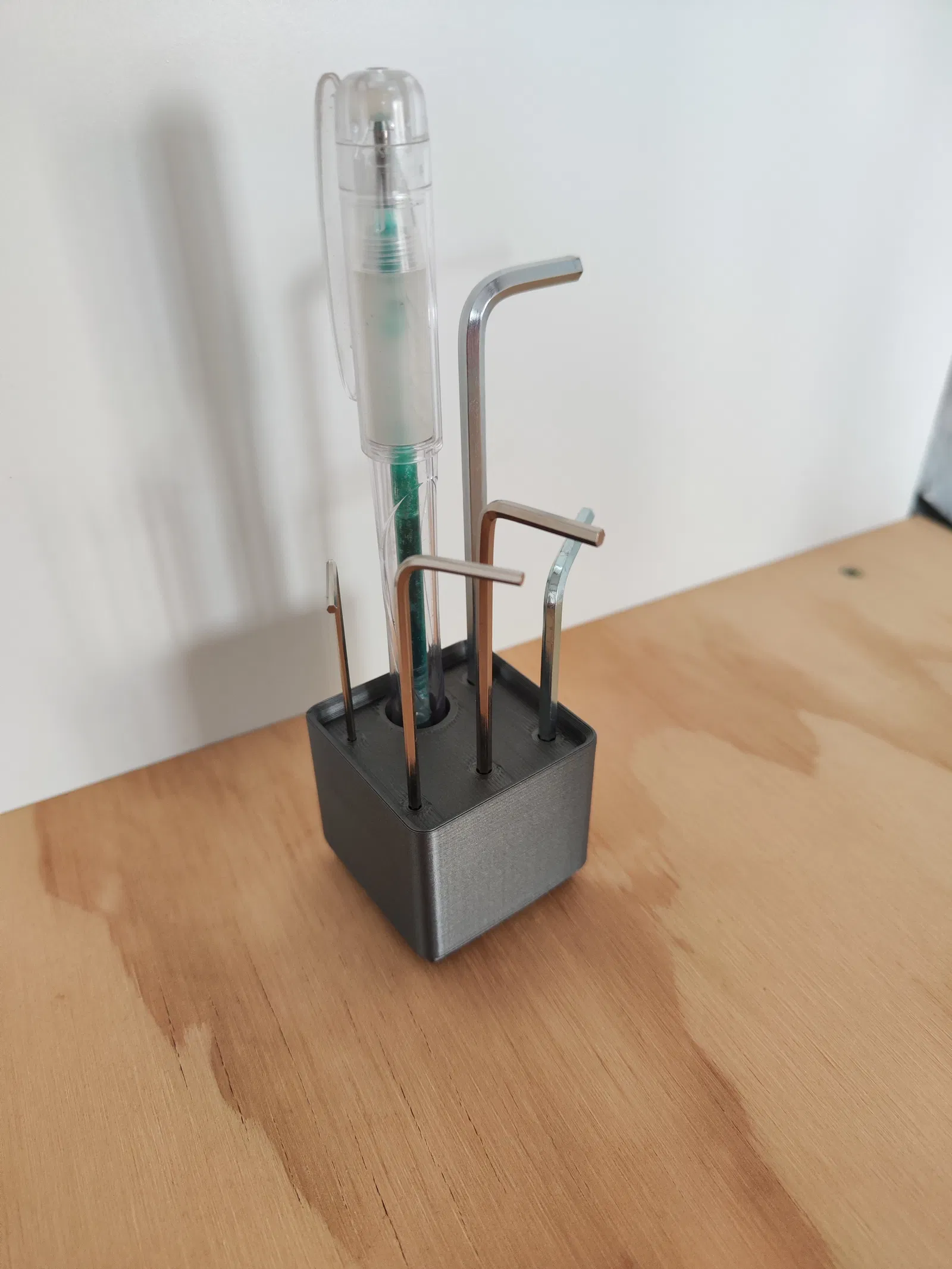 Giá đỡ Gridfinity này có kích thước 1u, chiều cao 5/6u, vừa vặn 5 cây lục giác từ 1,5 đến 4mm và một cây bút có đường kính 13mm. Rất tiện lợi để sắp xếp dụng cụ của bạn!
