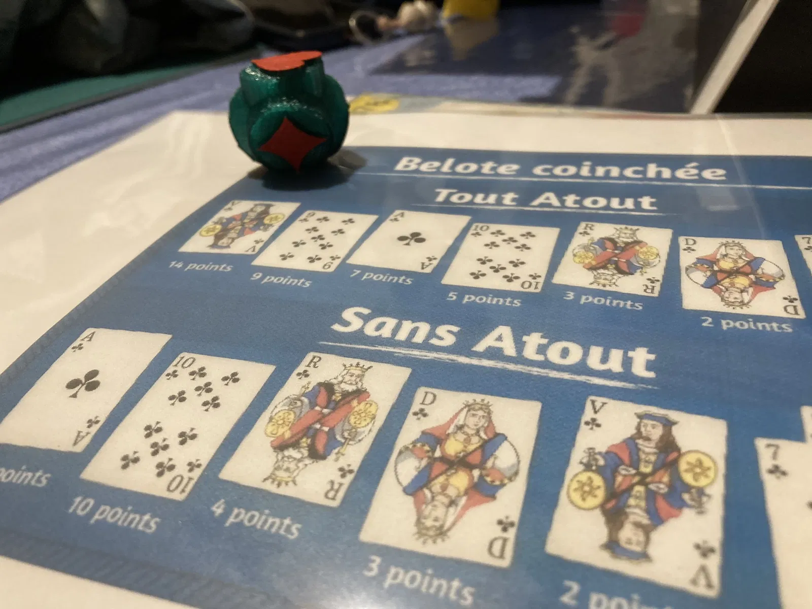 Con dấu này dùng để chỉ ra màu quân bài át chủ bài khi chơi belote. Vật phẩm này là một con dấu nhỏ gọn, dễ sử dụng, giúp bạn theo dõi quân bài lớn nhất trong ván chơi một cách hiệu quả. Rất phù hợp cho những người yêu thích trò chơi bài dân gian này.