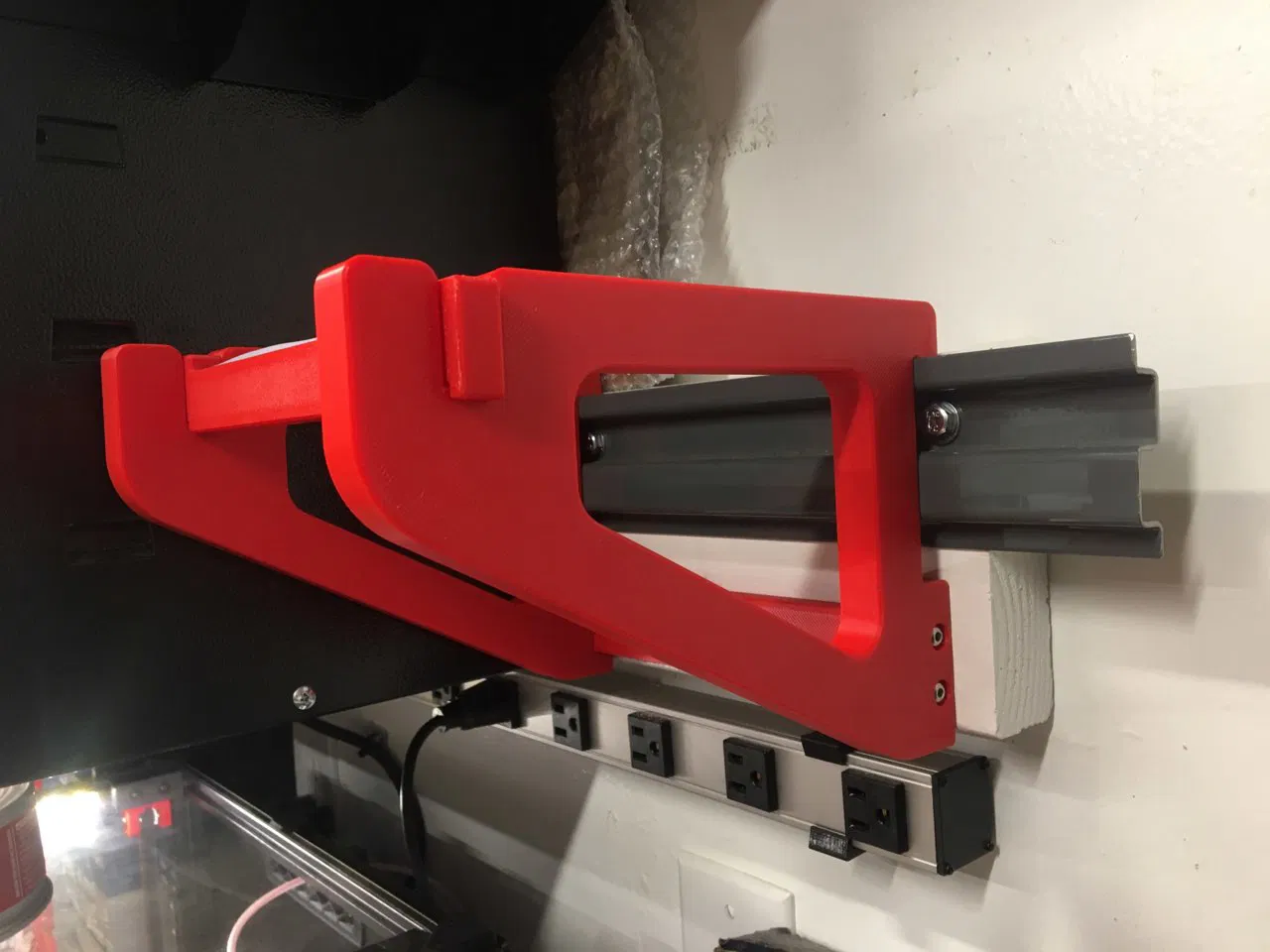 Tôi tìm thấy một vài tùy chọn gắn tường hoặc trần, nhưng ở vị trí tôi muốn gắn cuộn, tôi đã có sẵn một đoạn ray được lắp để treo vài chiếc Akrobin mà tôi không còn dùng ở đó nữa. Vì vậy, tôi đã thiết kế một giá đỡ cuộn gắn trực tiếp vào ray, và tôi chia sẻ nó ở đây vì có vẻ như nó sẽ hữu ích cho người khác.