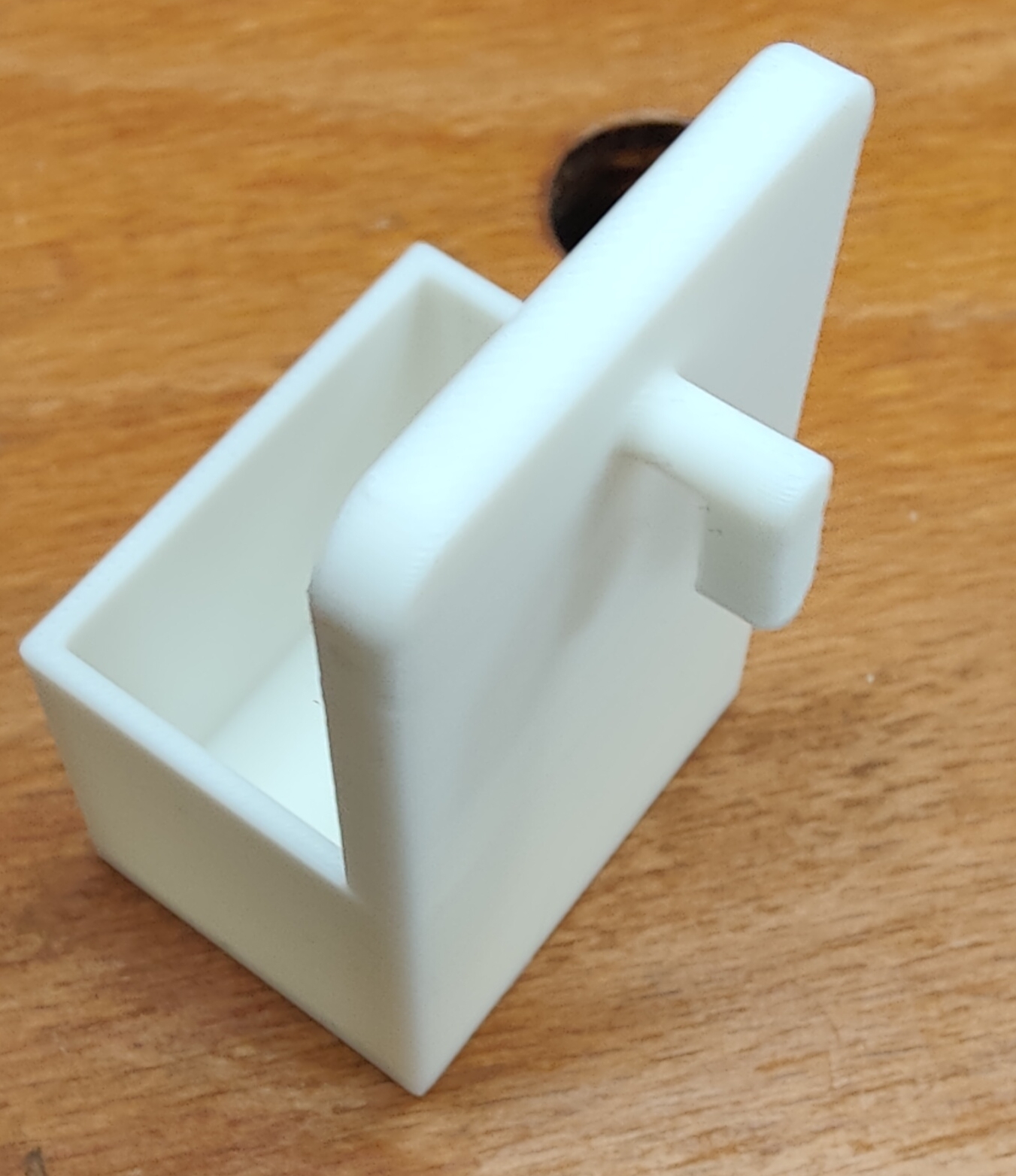 In 3D, in PLA với đầu phun 0.2mm, 3 lớp tường và 15% mật độ ruột. Móc treo này cần có support cho phần móc, rất tiện để gắn Bosch PLR15 lên bảng Skadis của IKEA đó.