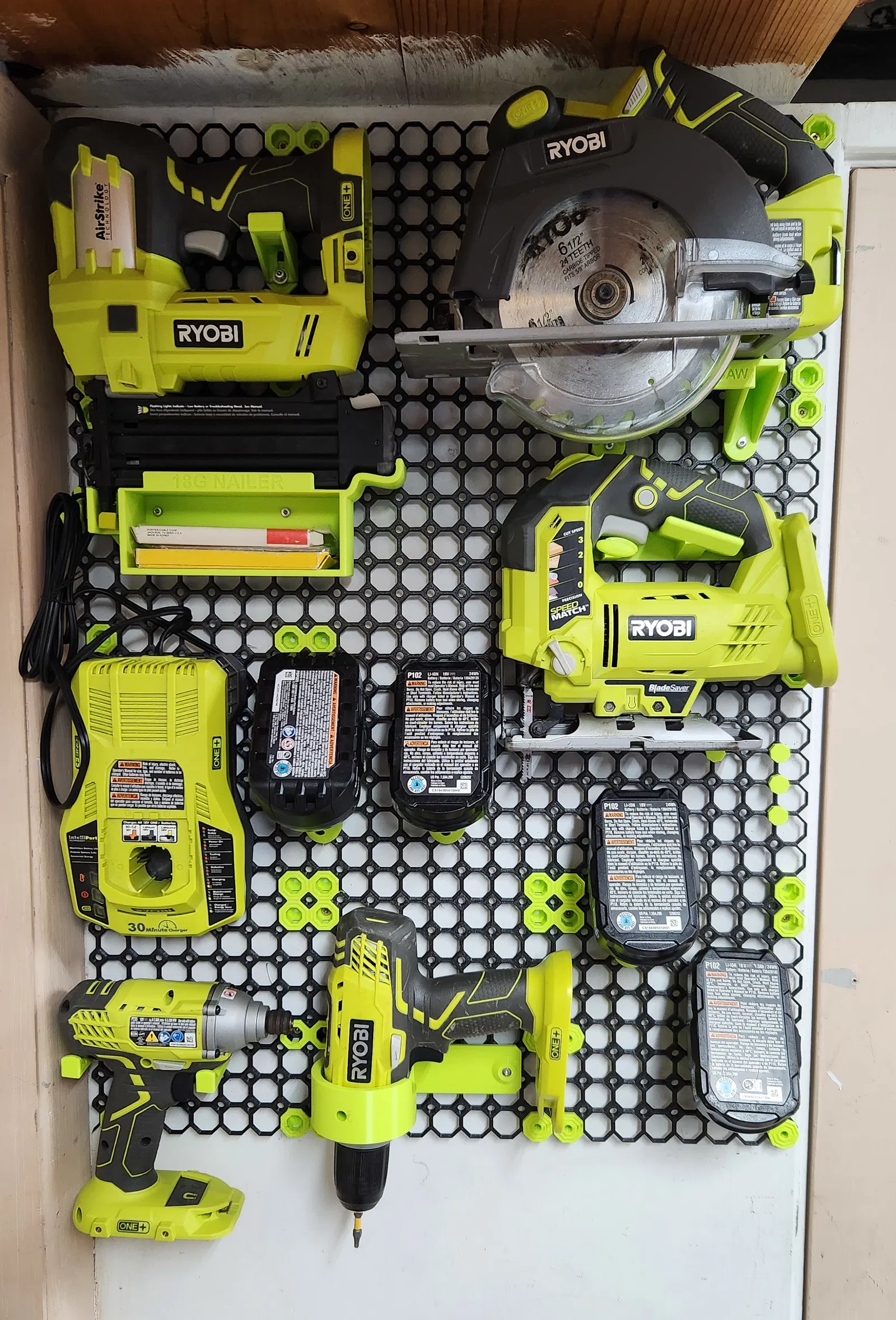 Đây là một phần của dòng giá đỡ Ryobi cho Multiboard, được thiết kế với giao diện và cảm giác tương tự, gắn các công cụ song song với tường và hướng nhãn ra ngoài. Cùng với một số vị trí sáng tạo trên Multiboard, nó mang lại một thẩm mỹ gọn gàng, có tổ chức và được thiết kế tốt.